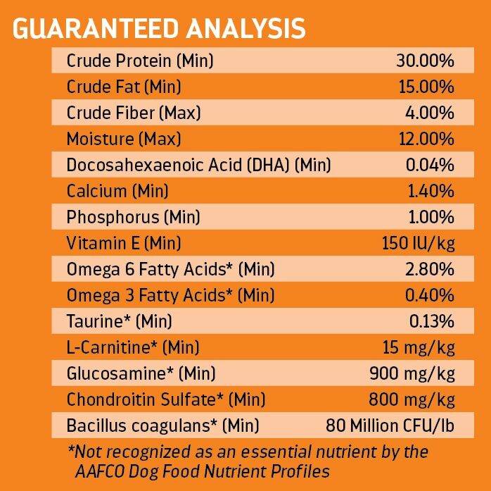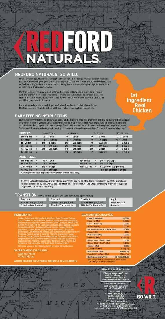 Helps supports brain development with DHA Ingredient is Chicken.Taurine Helps Support Heart Health Please always refer to the bag for the most up to date product information Crude Protein (Min) 30.00%; Crude Fat (Min) 15.00%; Crude Fiber (Max) 4.00%; Moisture (Max) 12.00%; Docosahexaenoic Acid (DHA) (Min) 0.04%; Calcium (Min) 1.40%; Phosphorus (Min) 1.00%; Vitamin E (Min) 150 IU/kg; Omega 6 Fatty Acids (Min) 2.80%; Omega 3 Fatty Acids (Min) 0.40%; Taurine (Min) 0.13%; L-Carnitine (Min) 900 mg/kg; Glucosamine (Min) 900 mg/kg; Chondroitin Sulfate (Min) 800 mg/kg; Bacillus coagulans (Min) 80 Million CFU/lb; Not recognized as an essential nutrient by the AAFCO Dog Food Nutrient Profiles; CALORIE CONTENT (CALCULATED); 3;653 kcal ME/kg; 473 kcal ME/cup; Redford Naturals Grain Free Puppy Chicken & Potato Recipe dog food is formulated to meet the nutritional levels established by the AAFCO Dog Food Nutrient Profiles for All Life Stages including growth of large size dogs (70 lbs. or more as an adult).