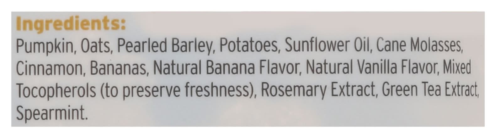 Ingredients: Pumpkin, Oats, Pearled Barley, Potatoes, Sunflower Oil, Cane Molasses, Cinnamon, Blueberries, Natural Blueberry Flavor, Natural Vanilla Flavor, Mixed Tocopherols (to Preserve Freshness), Rosemary Extract, Green Tea Extract, Spearmint Contains: Oat, Barley