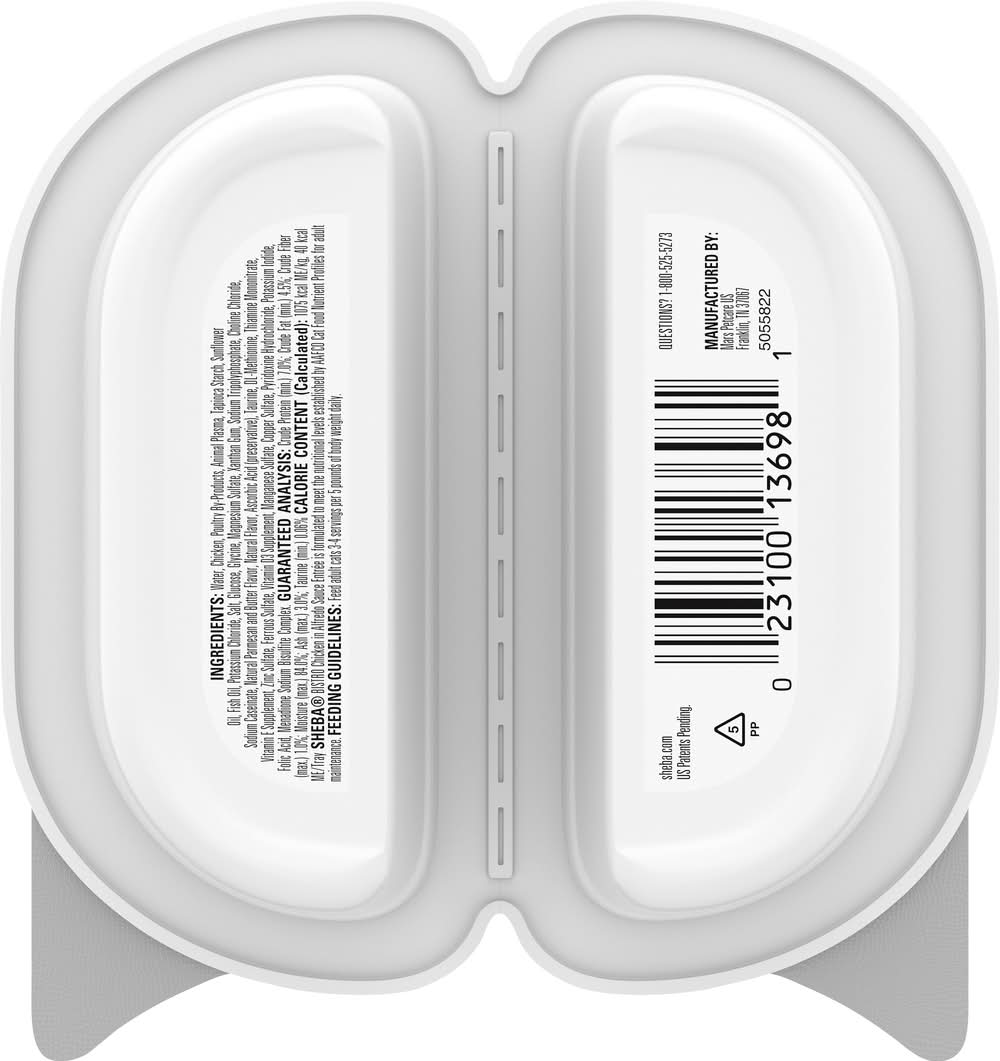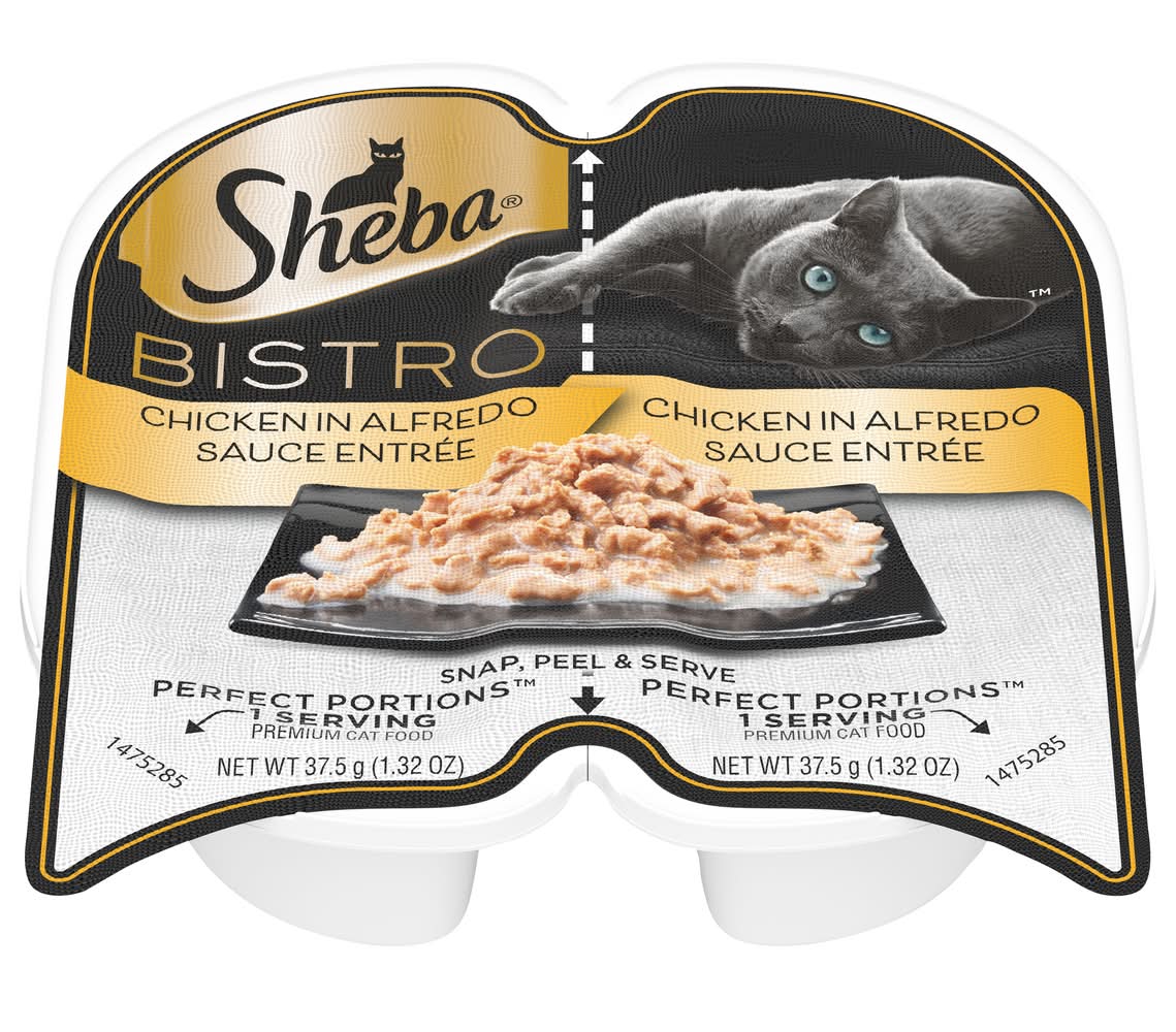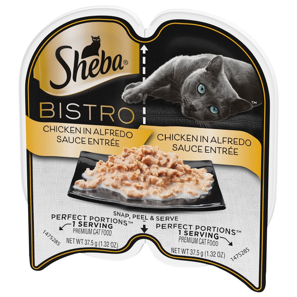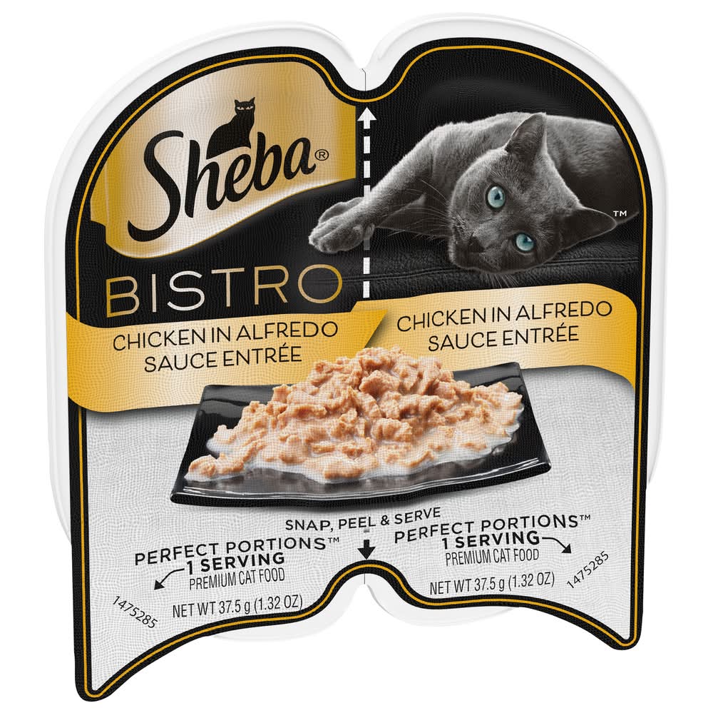 Irresistible SHEBA your cat desires in PERFECT PORTIONS™, two single servings for a fresh meal every time. They'll love the taste of these premium entrees, and you'll love no messy leftovers.|Delectable soft cat food entrée with irresistible Chicken in Alfredo Sauce flavor and a meaty texture cats love|Easy-to-use wet cat food trays: Just snap, peel, and serve Crude Protein (Min): 7.0%; Crude Fat (Min): 4.5%; Crude Fiber (Max): 1.0%; Moisture (Max): 84.0%; Ash (Max): 3.0%; Taurine (Min): 0.06%; Mars Petcare US, Franklin, TN, 37067