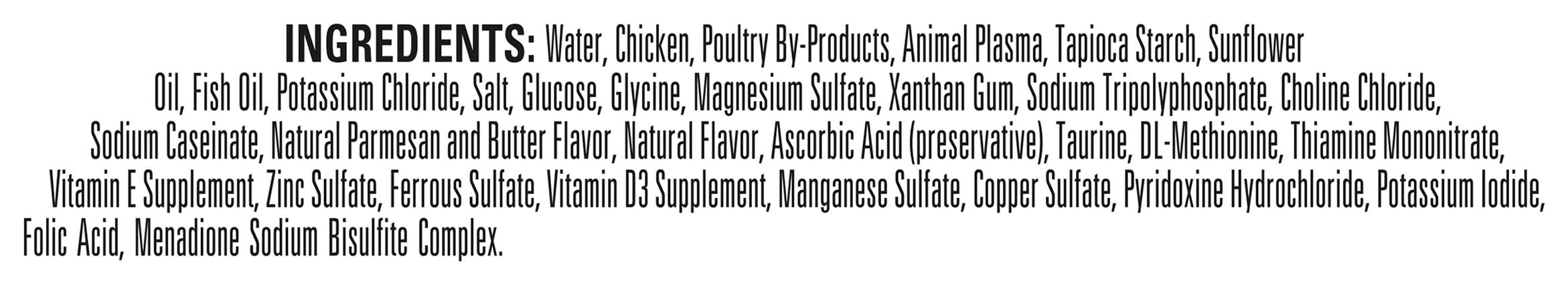 Ingredients: Water, Chicken, Poultry By-Products, Animal Plasma, Tapioca Starch, Sunflower Oil, Fish Oil, Potassium Chloride, Salt, Glucose, Glycine, Magnesium Sulfate, Xanthan Gum, Sodium Tripolyphosphate, Choline Chloride, Sodium Caseinate, Natural Parmesan and Butter Flavor, Natural Flavor, Ascorbic Acid (Preservative), Taurine, DL-Methionine, Thiamine Mononitrate, Vitamin E Supplement, Zinc Sulfate, Ferrous Sulfate, Vitamin D3 Supplement, Manganese Sulfate, Copper Sulfate, Pyridoxine Hydrochloride, Potassium Iodide, Folic Acid, Menadione Sodium Bisulfite Complex Contains: Fish, Sulfites