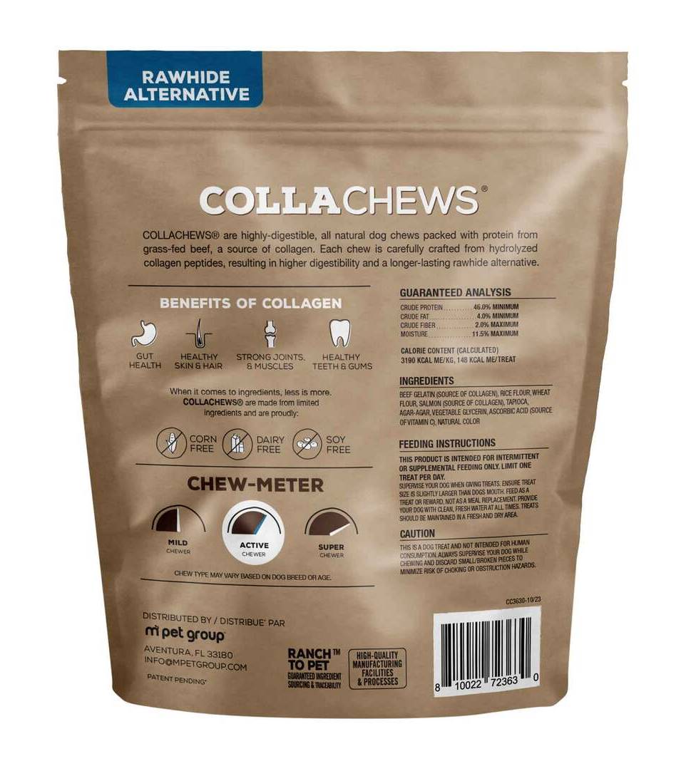 High-Quality Ingredients: Each TRURANCH Collagen Stick is made with real beef, chicken, bully, and salmon providing a scrumptious and safe alternative to rawhide. Free from dairy, soy, and corn, these treats are designed for all dogs, especially those with food sensitivities.|Enhances Health: Packed with natural ingredients and beef gelatin, a rich source of collagen, our sticks help maintain strong joints and muscles, promote gut health, and assist in cleaning teeth while the natural fibers help enhance digestion.|Allergy-Friendly Formula: Crafted without common allergens, our collagen sticks are perfect for dogs of all breeds and sizes. The absence of dairy, soy, and corn makes these chews a safe choice for dogs with specific dietary requirements.|Supports Dental Hygiene: The unique texture of the TRURANCH Collagen Sticks helps scrape away plaque and tartar build-up, promoting healthy teeth and gums. Regular chewing helps keep your dog's breath fresher and dental health in check.|Available in Various Sizes: Whether you have a small or large dog, our medium and large packs are ideal for tailoring to your dog's size and chewing habits, ensuring a satisfying and long-lasting chew experience. Crude Protein: 46% Min / Crude Fat 4% Min / Crude Fiber 2% Max / Moisture 11.5% Max / Calorie Content: 3192 KCAL ME/KG, 148 KCAL ME/TREAT