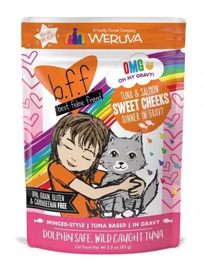 Tuna & Salmon Sweet Cheeks (3oz Pouch, Pack of 12) Red-meat tuna, and wild-caught salmon in a tasty gravy.|B.F.F. OMG - Your Best Feline Friend will love these extra juicy flavors. Oh my Gravy!|With even more gravy, and tender pieces of chicken - B.F.F. provides all the lean protein and moisture your cat needs to thrive.|Grain-free, Gluten-free, & Carrageenan-free. No corn, wheat or soy. Free from any artificial colors & preservatives|Produced in Human Food Facilities under the Strictest B.R.C. Global Standards for Food Crude Protein (Min): 9.0%; Crude Fat (Min): 1.4%; Crude Fiber (Max): 1.0%; Moisture (Max): 86.0%; Taurine (Min): 0.05%;