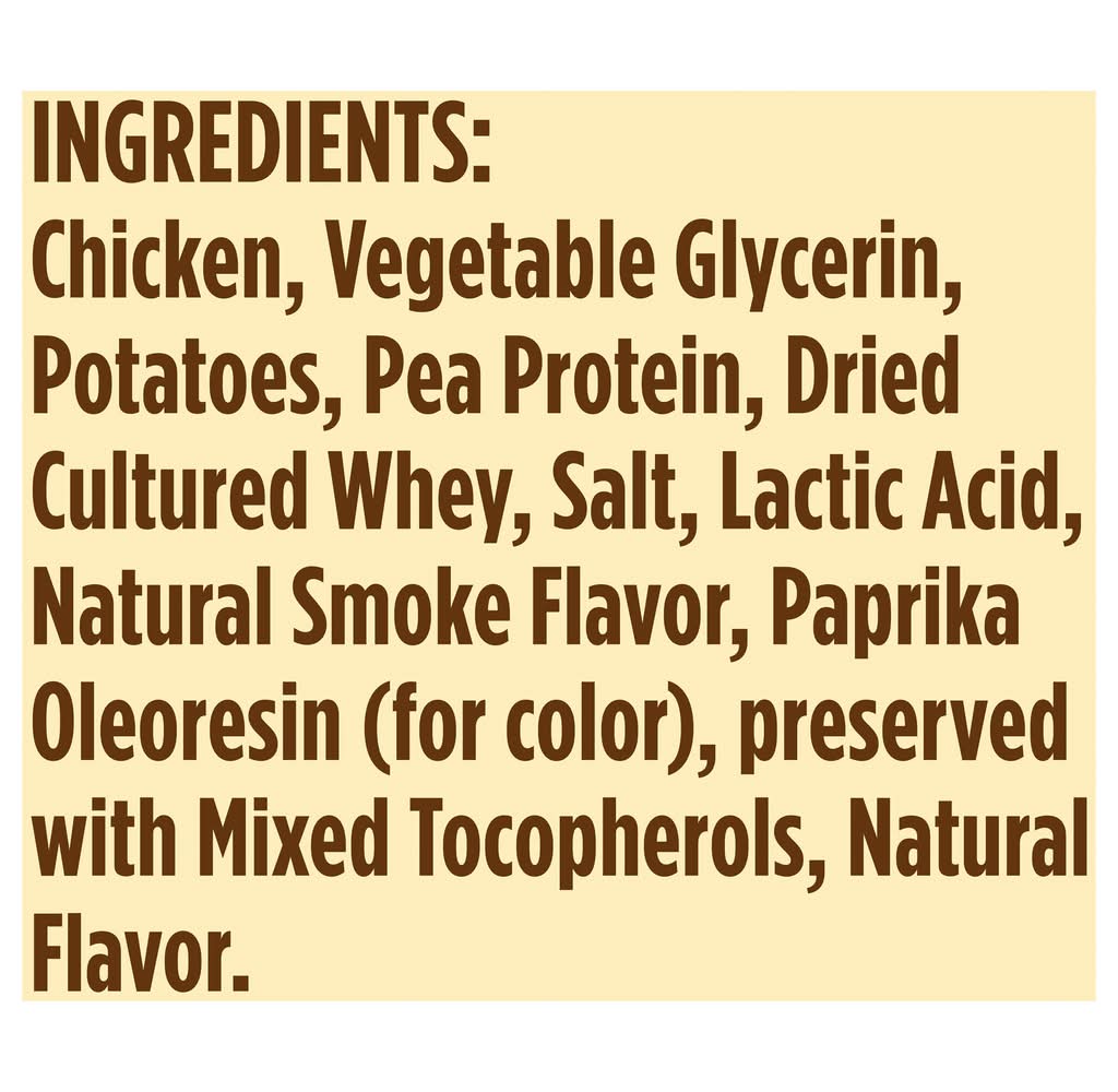 Ingredients: Chicken, Vegetable Glycerin, Potatoes, Pea Protein, Dried Cultured Whey, Salt, Lactic Acid, Natural Smoke Flavor, Paprika Oleoresin (for Color), Preserved with Mixed Tocopherols, Natural Flavor
