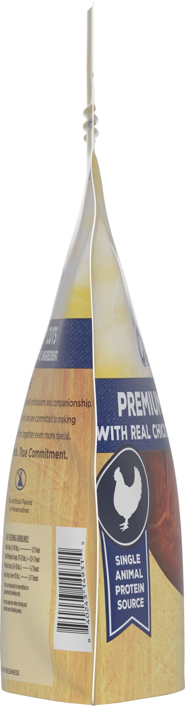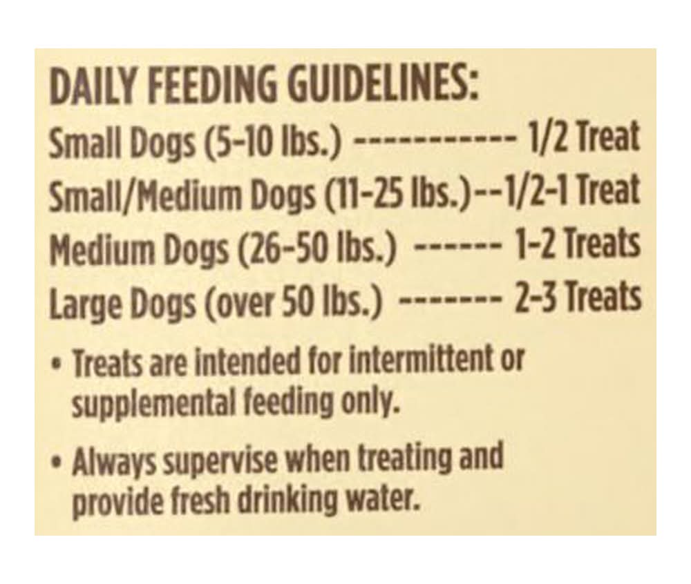 Directions for use: Directions: Store in a cool, dry place. Use within 30 days of opening for maximum freshness. Feeding guidelines: small dogs (5-10 lbs.) - 1/2-1 treat; small/medium dogs (11-25 lbs.) - 1 treat; medium dogs (26-50 lbs.) - 1-2 treats; large dogs (over 50 lbs.) - 2-3 treats. Treats are intended for intermittent or supplemental feeding only. Always supervise when treating and provide fresh drinking water. Storage recommendation: Store in a cool, dry place.