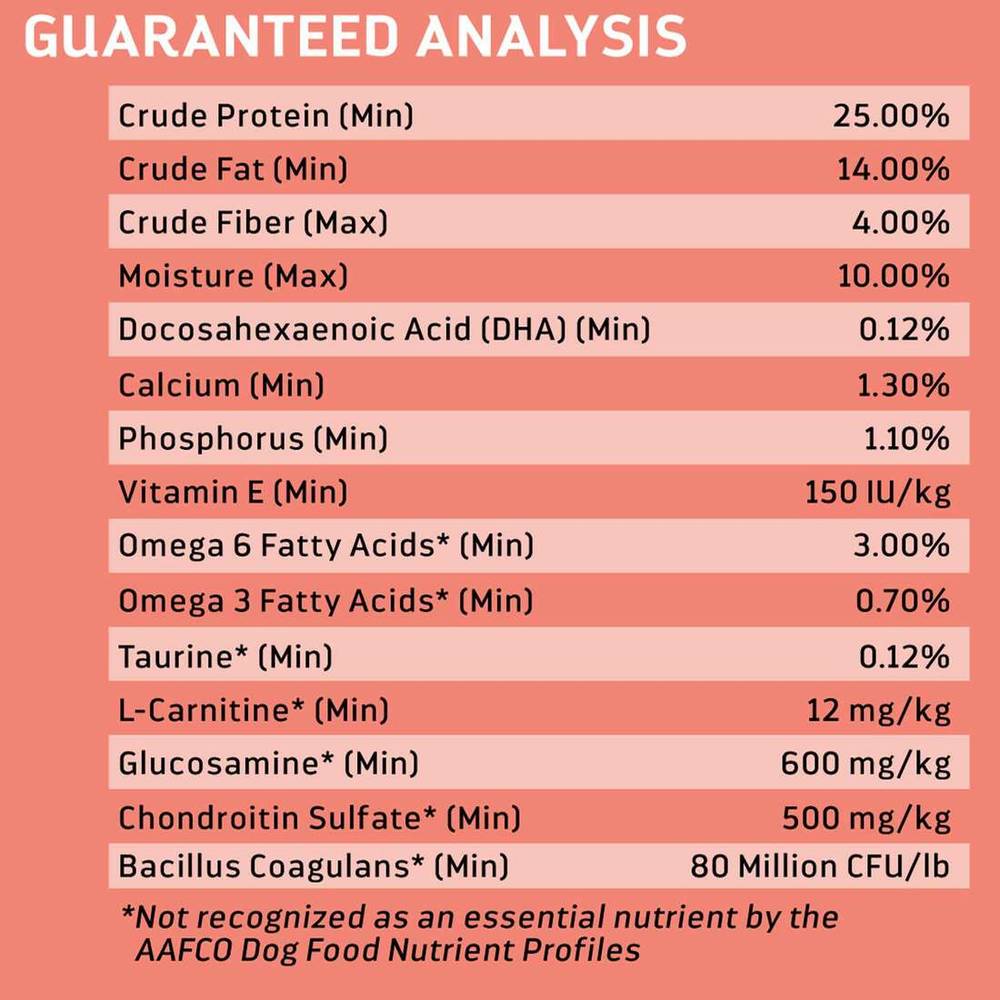 Helps supports brain development with DHA|#1 ingredient is salmon|Made in USA with responsibly sourced US & imported ingredients|Taurine Helps Support Heart Health|Please always refer to the bag for the most up to date product information Crude Protein (Min): 25.00%; Crude Fat (Min): 14.00%; Crude Fiber (Max): 4.00%; Moisture (Max): 10.00%; Docosahexaenoic Acid (DHA) (Min): 0.12%; Calcium (Min): 1.30%; Phosphorus (Min): 1.10%; Vitamin E (Min): 150 IU/kg; Omega 6 Fatty Acids* (Min): 3.00%; Omega 3 Fatty Acids* (Min): 0.70%; Taurine* (Min): 0.12%; LCarnitine* (Min): 12 mg/kg; Glucosamine* (Min): 600 mg/kg; Chondroitin Sulfate* (Min): 500 mg/kg; Bacillus Coagulans* (Min): 80 Million CFU/lb *Not recognized as an essential nutrient by the AAFCO Dog Food Nutrient Profiles CALORIE CONTENT (CALCULATED): 3 710 kcal ME/kg; 408 kcal ME/cup *Redford Naturals Puppy Salmon & Brown Rice Recipe dog food is formulated to meet the nutritional levels established by the AAFCO Dog Food Nutrient Profiles for All Life Stages including growth of large size dogs (70 lb. or more as an adult).