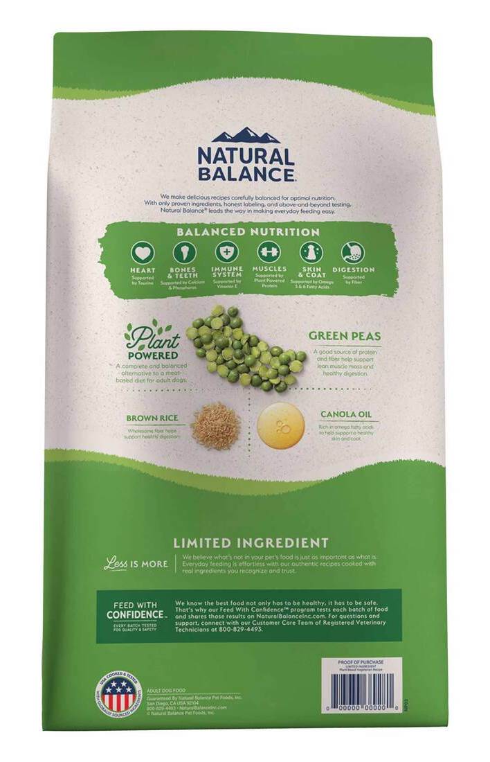 VEGETARIAN, VEGAN PLANT-BASED PROTEIN formula contains the same essential nutrients as Natual Balance's meat-based dog food; Barley and peas provide dogs quality nutrition while maintaining a meat-free home|LIMITED INGREDIENT DIET PHILOSOPHY Formulated with a simplified list of premium ingredients; a single animal protein source, healthy grains, and no soy, gluten, artificial colors or flavors; Natural Balance uses fewer ingredients so pets, and pet parents, can live healthy lives|VEGETARIAN AND VEGAN RECIPE with no animal or dairy products; Crafted with wholesome grains and vegetables; Complete and balanced essential nutrients to help maintain your dog's healthy immune system Crude Protein (Min): 18%; Crude Fat (Min): 8%; Crude Fiber (Min): 5%; Moisture (Max): 10%; Calcium (Min): 0.50%; Phosphorus (Min):0.40%; Vitamin E (Min): 50 iu/kg; Taurine* (Min): 0.10%; Omega 3 Fatty Acids* (Min): 0.30%; Omega 6 Fatty Acids* (Min): 1.50%; * not recognized as an essential nutrient by the aafco dog nutrient profiles. Size: Adult