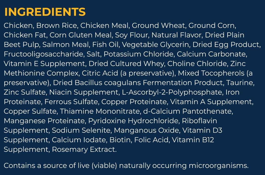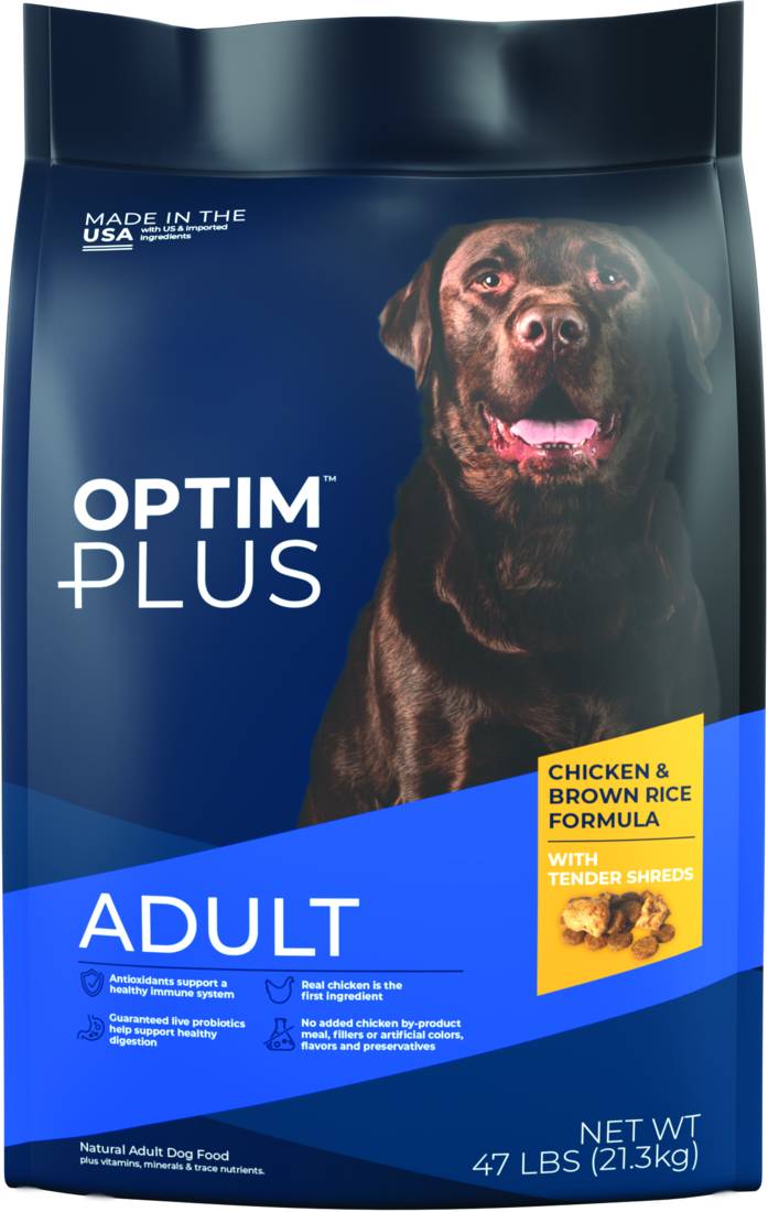 Crunchy kibble and tender shreds add flavor and texture Antioxidants support a healthy immune system Guaranteed live probiotics help support healthy digestion Real chicken is always the first ingredient No added chicken by-product meal, fillers or artificial colors, flavors and preservatives OptimPlus Adult Chicken & Brown Rice Formula With Tender Shreds dog food is formulated to meet the nutritional levels established by the AAFCO Dog Food Nutrient Profiles for maintenance.