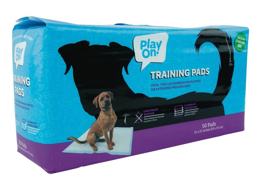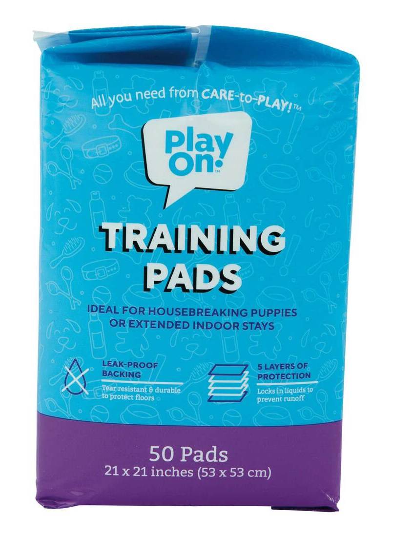 21x21 inches Play On makes it easier for pets to get their fetch on, catch on, wag and wiggle on, by removing the guess work out of finding the best for pets and with the Play On line of training pads your sure to save your precious surfaces from getting messed on! The quilted anti-tracking top layer soaks in wetness and ensures your pets mess doesn't go with them|Equipped with five layers of leak proof protection, Play On training pads are good for more than just number one and number two Protects surfaces with leak-proof and tear-resistant backingGreat for more than just potty training Great to use for things like crate and cage lining, under cat litter boxes, roof leaks or even oil changes to prevent spills