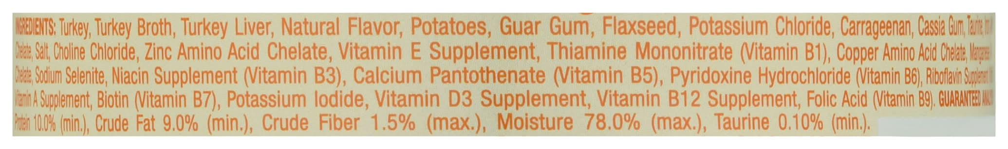 Ingredients: Turkey, Turkey Broth, Turkey Liver, Natural Flavor, Potatoes, Guar Gum, Flaxseed, Potassium Chloride, Carrageenan, Cassia Gum, Taurine, Iron Amino Acid Chelate, Salt, Choline Chloride, Zinc Amino Acid Chelate, Vitamin E Supplement, Thiamine Mononitrate (Vitamin B1), Copper Amino Acid Chelate, Manganese Amino Acid Chelate, Sodium Selenite, Niacin Supplement (Vitamin B3), Calcium Pantothenate (Vitamin B5), Pyridoxine Hydrochloride (Vitamin B6), Riboflavin Supplement (Vitamin B2), Vitamin A Supplement, Biotin (Vitamin B7), Potassium Iodide, Vitamin D3 Supplement, Vitamin B12 Supplement, Folic Acid (Vitamin B9)