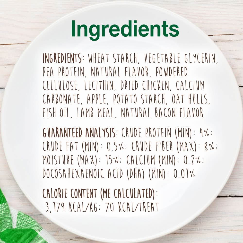 Ingredients: Wheat Starch; Glycerin; Pea Protein; Natural Flavor; Powdered Cellulose; Lecithin; Dried Chicken; Calcium Carbonate; Apple; Potato Starch; Oat Hulls; Fish Oil; Lamb Meal; Natural Bacon Flavor Contains: Contains: wheat, soy