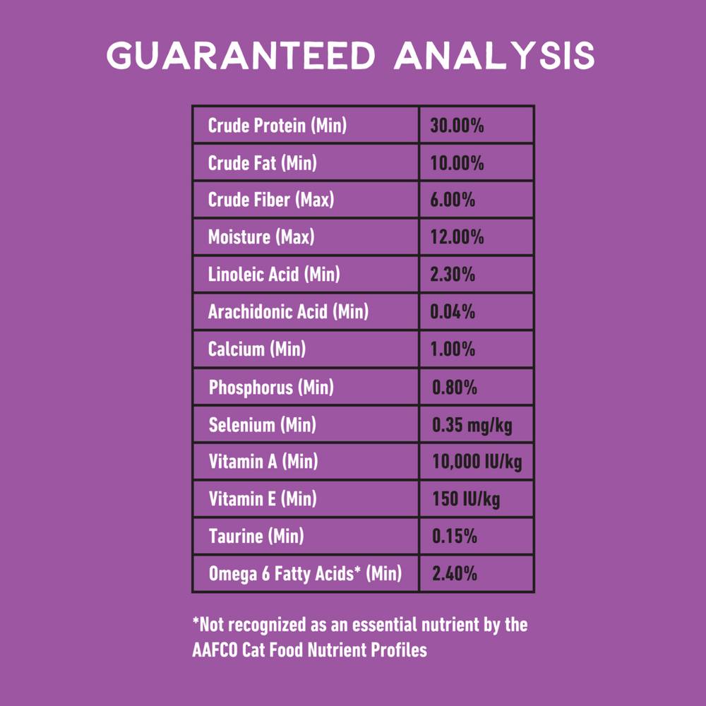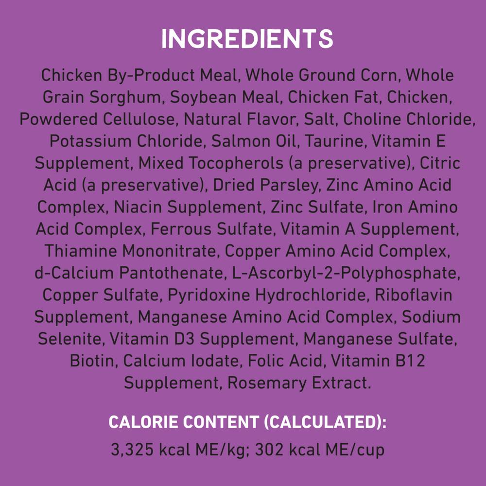 Made with Real Chicken|Helps achieve a healthy weight|Optimal fiber blend helps support healthy digestion|Made in USA with US & imported ingredients|No artificial colors, flavors or preservatives Crude Protein (Min) 30.00%, Crude Fat (Min) 10.00%, Crude Fiber (Max) 6.00%, Moisture (Max) 12.00%, Linoleic Acid (Min) 2.30%, Arachidonic Acid (Min) 0.04%, Calcium (Min) 1.00%, Phosphorus (Min) 0.80%, Selenium (Min) 0.35 mg/kg, Vitamin A (Min) 10,000 IU/kg, Vitamin E (Max) 150 IU/kg, Taurine (Min) 0.15%, Omega 6 Fatty Acids* (Min) 2.40; CALORIE CONTENT (CALCULATED): 3,325 kcal ME/kg; 302 kcal ME/cup. Mitten's Morsels Indoor Morsel Mix adult cat food is formulated to meet the nutritional levels established by the AAFCO Cat Food Nutrient Profiles for maintenance.