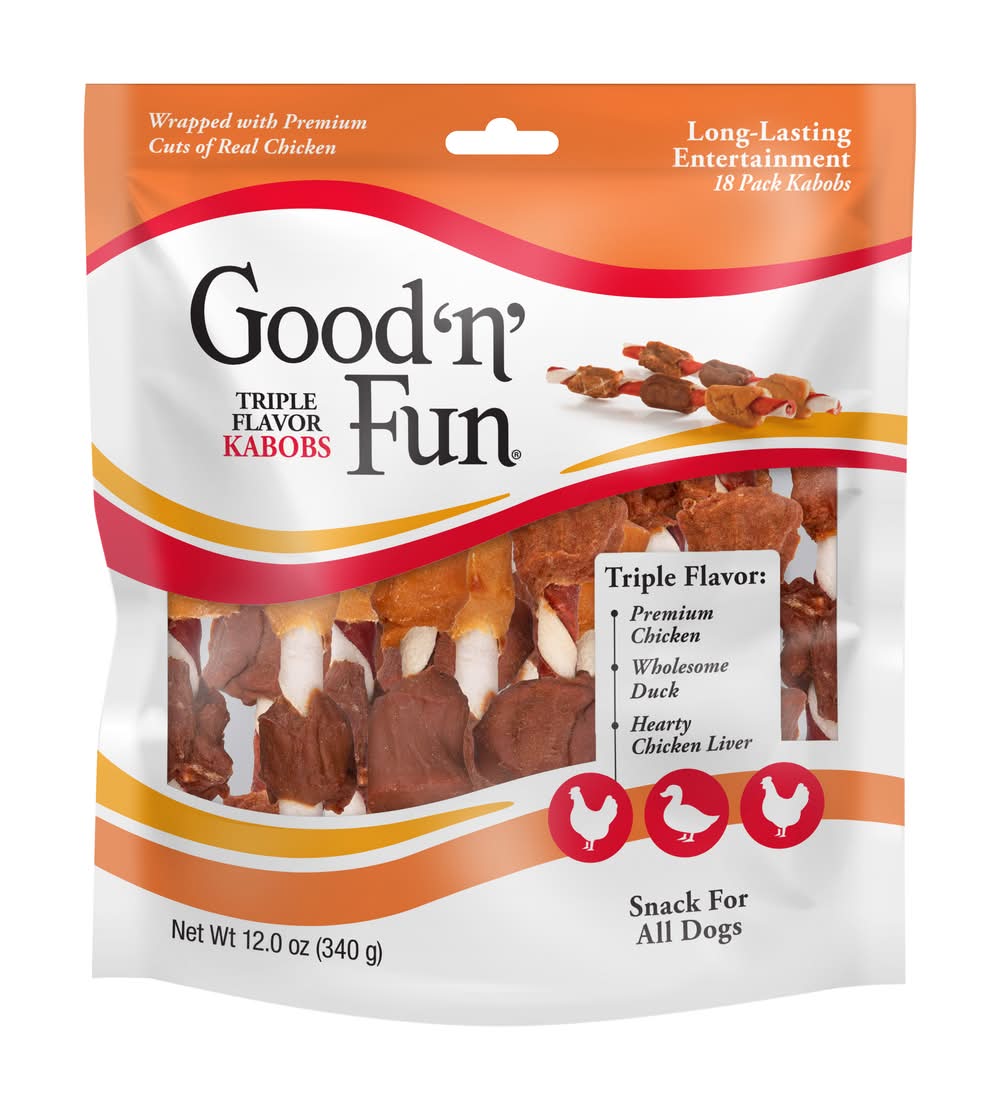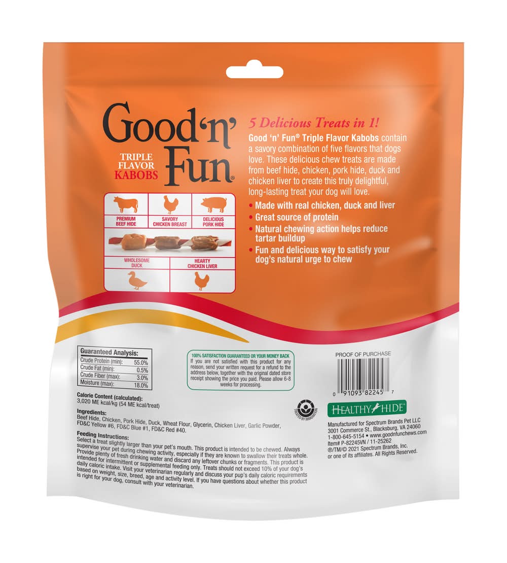 Wrapped with premium cuts of real chicken. Long-lasting entertainment. Triple Flavor: Premium Chicken; wholesome duck; heart chicken liver. Snack for all dogs. Premium beef hide. Savory chicken breast. Delicious pork hide. Wholesome duck. Hearty chicken liver. Good n Fun triple flavor kabobs contain a savory combination of five flavors that dogs love. These delicious chew treats are made from beef hide, chicken, pork hide, duck and chicken liver to create this truly delightful, long-lasting treat your dog will love. Made with real chicken, duck and liver. Natural chewing action helps reduce tartar buildup. Fun and delicious way to satisfy your dog's natural urge to chew. 100% Satisfaction Guaranteed or Money Back: If you are not satisfied with this product for any reason, send your written request for a refund to the address at right, together with the original dated store receipt showing the price you paid. Please allow 6-8 weeks for processing. Spectrum Brands Pet Llc, 3001 Commerce St.,Blacksburg,,VA,24060