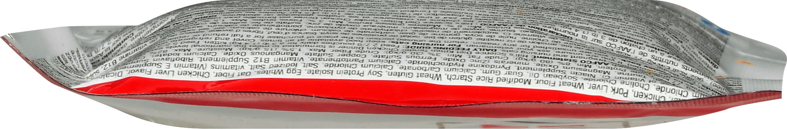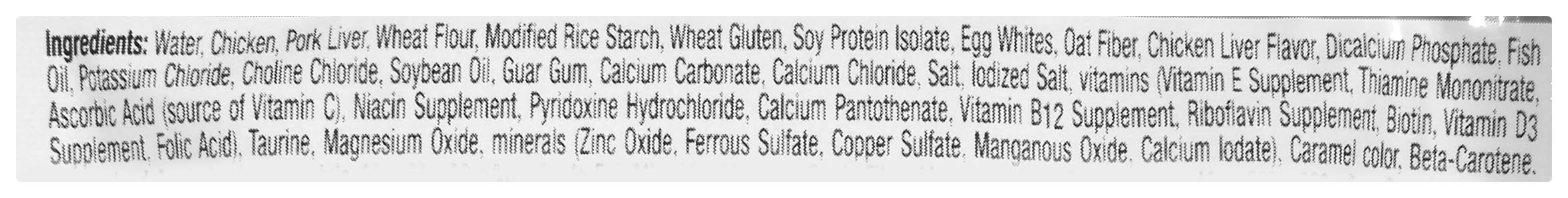 Ingredients: Water, Chicken, Pork Liver, Wheat Flour, Modified Rice Starch, Wheat Gluten, Soy Protein Isolate, Egg Whites, Oat Fiber, Chicken Liver Flavor, Dicalcium Phosphate, Fish Oil, Potassium Chloride, Choline Chloride, Soybean Oil, Guar Gum, Calcium Carbonate, Calcium Chloride, Salt, Iodized Salt, Vitamins (Vitamin E Supplement, Thiamine Mononitrate, Ascorbic Acid (Source of Vitamin C), Niacin Supplement, Pyridoxine Hydrochloride, Calcium Pantothenate, Vitamin B12 Supplement, Riboflavin Supplement, Biotin, Vitamin D3 Supplement, Folic Acid), Taurine, Magnesium Oxide, Minerals (Zinc Oxide, Ferrous Sulfate, Copper Sulfate, Manganous Oxide, Calcium Iodate), Caramel Color, Beta-Carotene Contains: Wheat, Gluten, Soybeans, Eggs, Fish