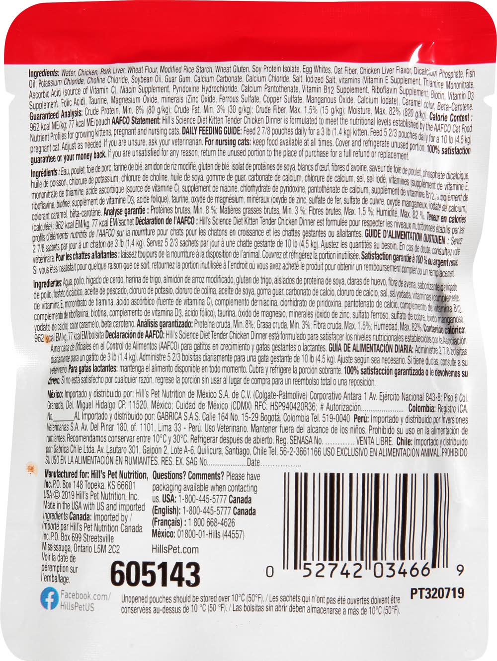 Calorie Content : 962 kcal ME/kg; 77 kcal ME/pouch. AAFCO Statement: Hill's Science Diet Kitten Tender Chicken Dinner is formulated to meet the nutritional levels established by the AAFCO Cat Food Nutrient Profiles for maintenance of adult cats. Premium cat food in gravy. Science Diet: Veterinarian recommended. 100% satisfaction guarantee or your money back. If you are unsatisfied for any reason, return the unused portion to the place of purchase for a full refund or replacement.