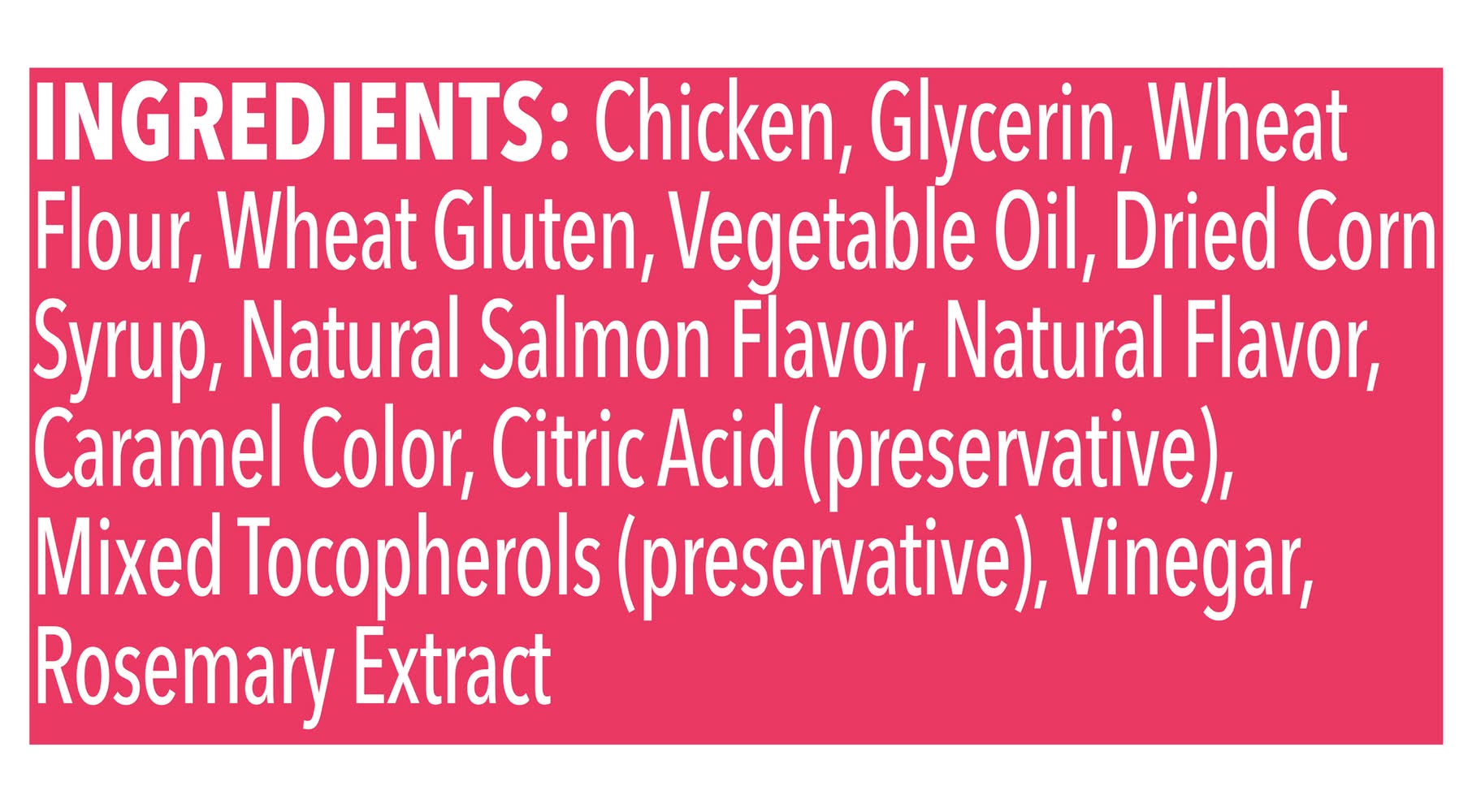 Ingredients: Chicken, Glycerin, Wheat Flour, Wheat Gluten, Vegetable Oil, Dried Corn Syrup, Natural Salmon Flavor, Natural Flavor, Caramel Color, Citric Acid (Preservative), Mixed Tocopherols (Preservative), Vinegar, Rosemary Extract Contains: Wheat, Gluten, Corn, Fish, Salmon