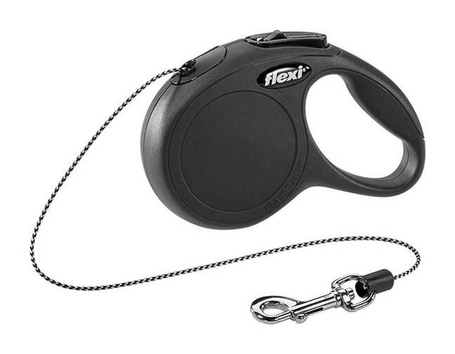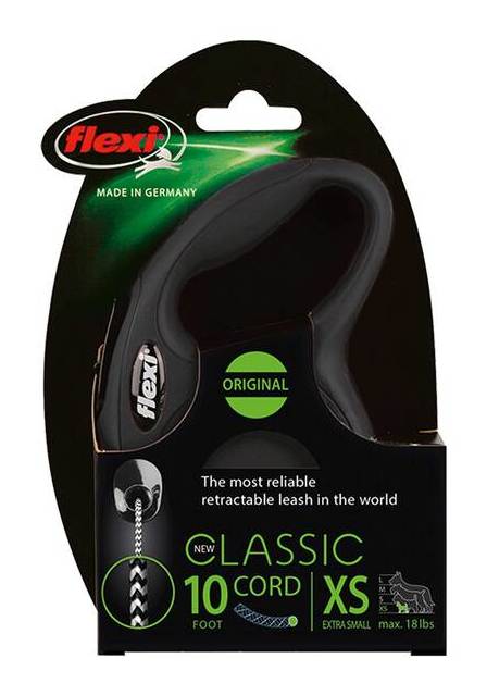 New Classic - the classic, perfect retractable leash from Flexi, featuring a stylish design and an ergonomic grip. It can be accessorised with practical accessories like the Multi Box to store treats or poop bags and the LED Lighting System to increase visibility in the dark. With its innovative short-stroke braking system, the New Classic creates a high level of safety and comfortable handling during walks. The modern New Classic leash in size Medium comes with a cord length of 16 feet, includes a reflective bite belt and offers plenty of freedom of movement for dogs up to 44 lbs. The sturdy casing with ergonomic handle is available in red, blue, black or pink. • Color: Black • Size: X Small