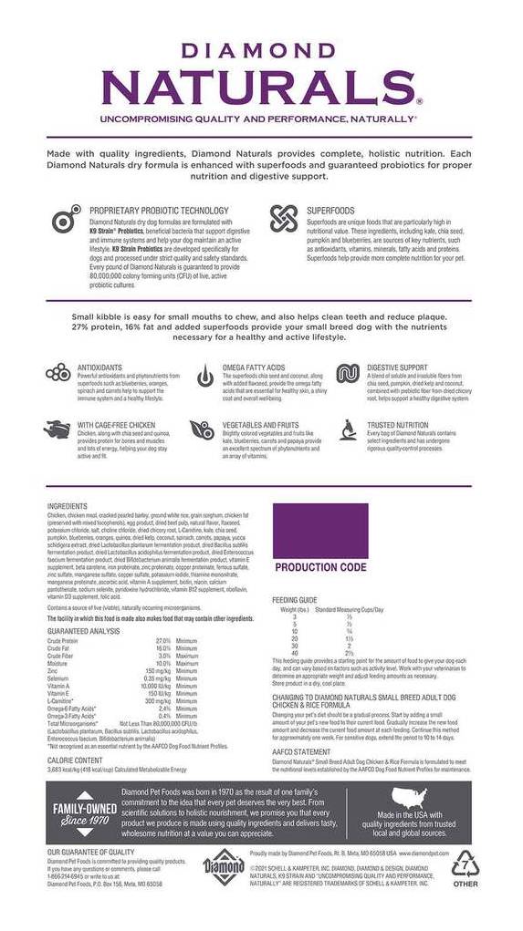 With cage-free chicken for great taste and nutrition|Small, crunchy kibble is easy for small mouths to chew and also helps clean teeth|Balanced nutrients necessary for small breed dogs|Enhanced with superfoods and guaranteed probiotics Crude Protein 27.0% Minimum, Crude Fat 16.0% Minimum, Crude Fiber 3.0% Maximum, Moisture 10.0% Maximum, Zinc 150 mg/kg Minimum, Selenium 0.35 mg/kg Minimum, Vitamin A 10,000 IU/kg Minimum, Vitamin E 150 IU/kg Minimum, L-Carnitine* 300 mg/kg Minimum, Omega-6 Fatty Acids* 2.4% Minimum, Omega-3 Fatty Acids* 0.4% Minimum, Total Microorganisms* Not Less Than 80,000,000 CFU/lb, (Lactobacillus plantarum, Bacillus subtilis, Lactobacillus acidophilus, Enterococcus faecium, Bifidobacterium animalis), *Not recognized as an essential nutrient by the AAFCO Dog Food Nutrient Profiles.