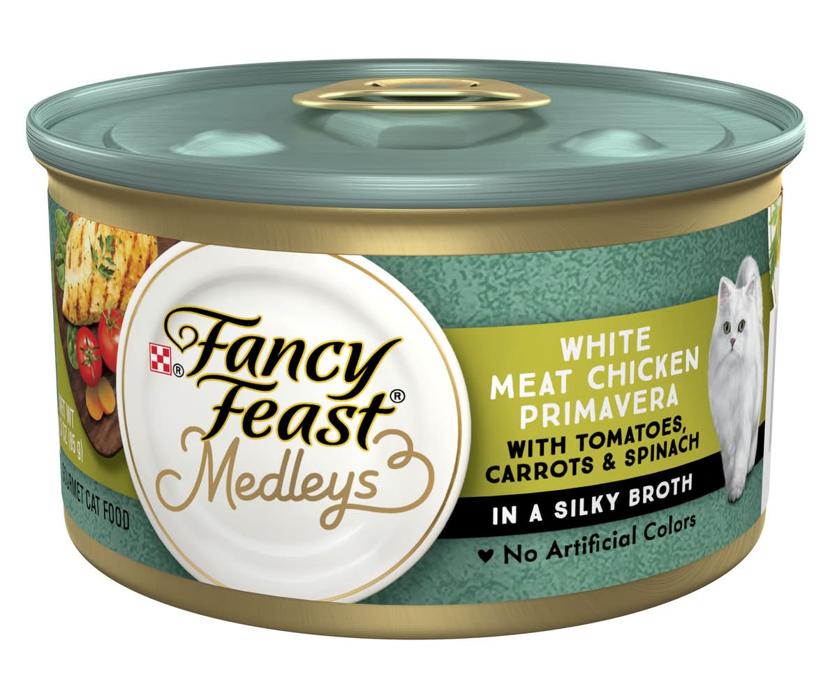 Crafted in partnership with our expert chefs and nutritionists, each Fancy Feast Medleys recipe features exceptional combinations inspired by dishes from around the world. Every serving of this Fancy Feast flaked wet cat food chicken formula features a thoughtful blend with real chicken, tomatoes, carrots and spinach in a delicious Fancy Feast broth .This Fancy Feast Medleys adult cat food formula is 100 percent complete and balanced for adult cats without artificial colors or preservatives. Share the joy with your cat as they scamper over each time you open up a can of delicious Fancy Feast canned cat food chicken primavera. For cats who love different flavors and textures in their diets, sample our other Fancy Feast Medleys varieties of wet food for cats and treat them to a gourmet dining experience every day.