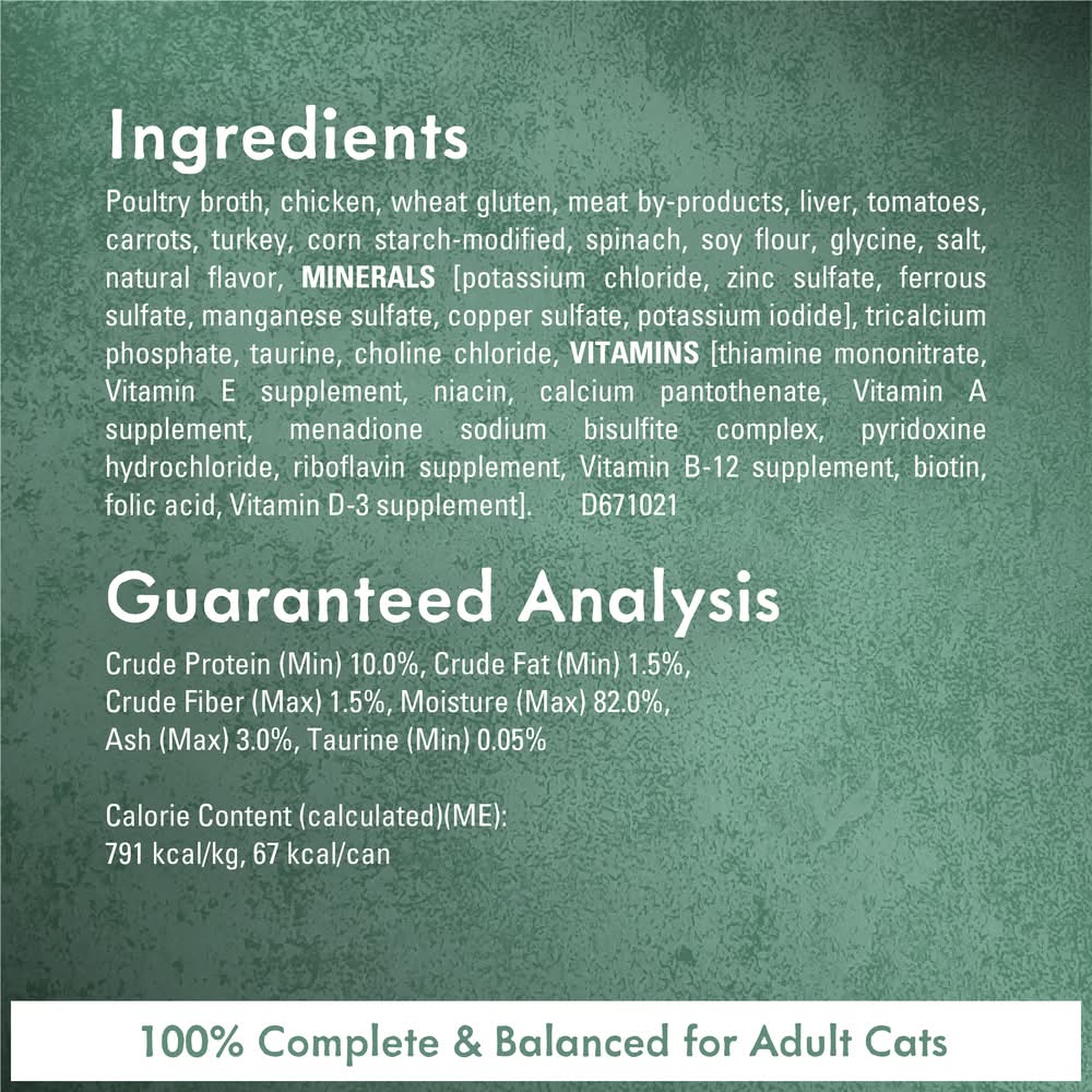 Ingredients: Poultry Broth, Chicken, Wheat Gluten, Meat By-Products, Liver, Tomatoes, Carrots, Turkey, Corn Starch-Modified, Spinach, Soy Flour, Glycine, Salt, Natural Flavor, MINERALS (Potassium Chloride, Zinc Sulfate, Ferrous Sulfate, Manganese Sulfate, Copper Sulfate, Potassium Iodide), Tricalcium Phosphate, Taurine, Choline Chloride, VITAMINS (Thiamine Mononitrate, Vitamin E Supplement, Niacin, Calcium Pantothenate, Vitamin A Supplement, Menadione Sodium Bisulfite Complex, Pyridoxine Hydrochloride, Riboflavin Supplement, Vitamin B-12 Supplement, Biotin, Folic Acid, Vitamin D-3 Supplement), . D671021