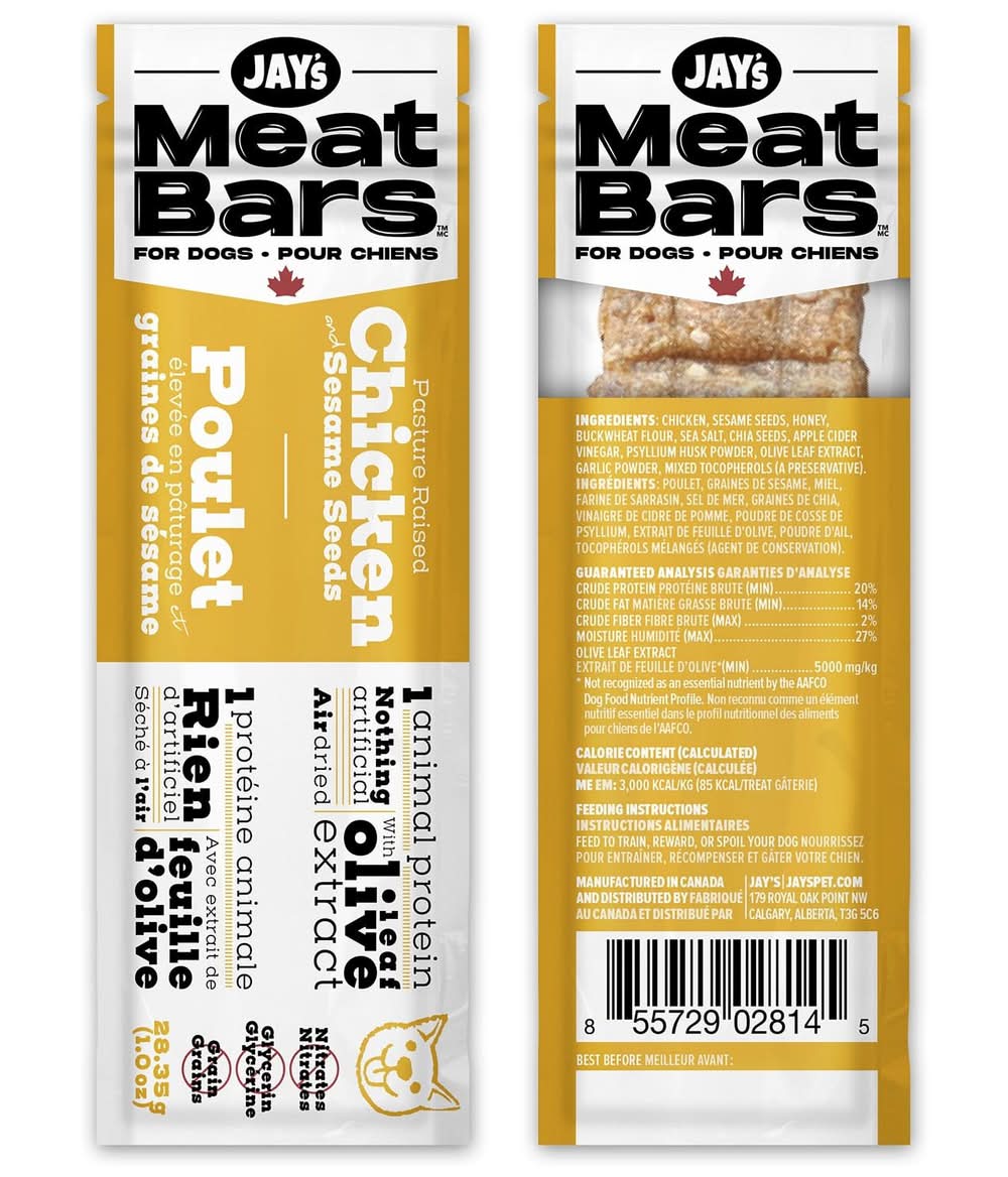 Jay's Meat Bars Pasture Raised Chicken & Sesame Dog Treats are individually wrapped and made with 75% fresh chicken and infused with health boosting sesame seeds and olive leaf extract. These meatbars are gently dehydrated and air dried to make sure they are as close to being unprocessed as possible. These dog treats have nothing artificial, are free of glycerine, and have a soft meaty texture that your dog cannot resist. Easy to break into smaller pieces. Key Benefits: Made with 75% fresh chicken Infused with health boosting sesame seeds and olive leaf extract Gently dehydrated and air dried Nothing artificial - grain free, free of glycerine & nitrates Canadian Made and Canadian Sourced Size: 1 oz
