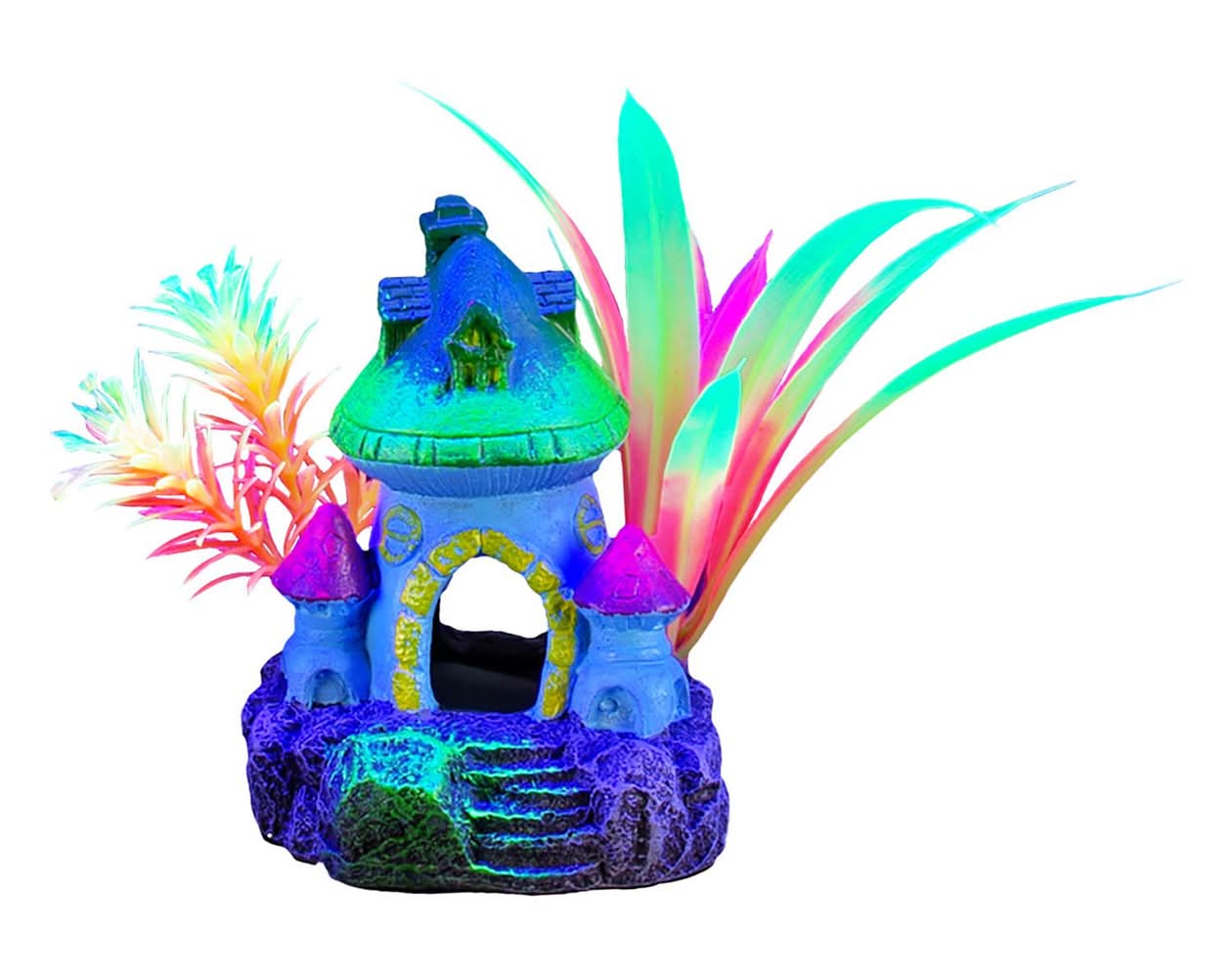 Marina iGlo Fluorescent Mushroom House with Plants Ornament helps create a vibrant aquarium setting while providing maximum fluorescence when placed under blue LEDs. Features: Creates a shelter for fish Provides a glowing effect under blue LEDs Made of non toxic material - safe for all aquarium inhabitants Easy maintenance Dimensions: 7.3cm L x 7.3cm W x 9cm H (3" L x 3" W x 3.5" H) Size: 4 in