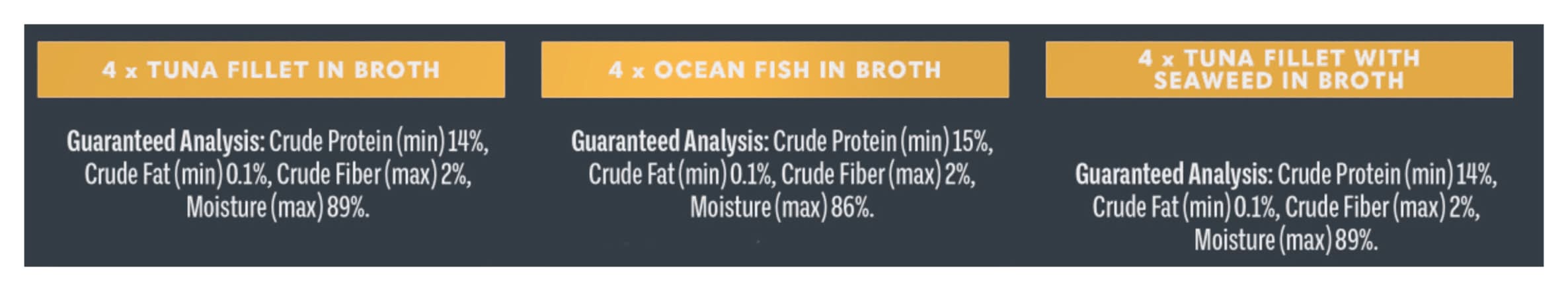 Ingredients: Tuna Fillet in Broth: Tuna Fillet, Fish Broth. Ocean Fish in Broth: Mackerel, Tuna Fillet, Fish Broth. Tuna Fillet with Seaweed in Broth: Tuna Fillet, Fish Broth, Dried Seaweed Meal Contains: Fish, Tuna, Fish, Mackerel, Fish