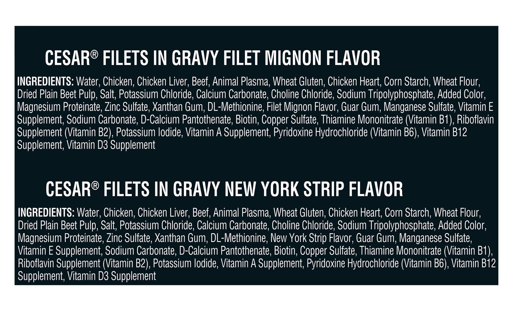 Ingredients: Cesar Filets in Gravy Filet Mignon Flavor: Water, Chicken, Chicken Liver, Beef, Animal Plasma, Wheat Gluten, Chicken Heart, Corn Starch, Wheat Flour, Dried Plain Beet Pulp, Salt, Potassium Chloride, Calcium Carbonate, Choline Chloride, Sodium Tripolyphosphate, Added Color, Magnesium Proteinate, Zinc Sulfate, Xanthan Gum, DL-Methionine, Filet Mignon Flavor, Guar Gum, Manganese Sulfate, Vitamin E Supplement, Sodium Carbonate, D-Calcium Pantothenate, Biotin, Copper Sulfate, Thiamine Monohydrate (Vitamin B1), Riboflavin Supplement (Vitamin B2), Potassium Iodide, Vitamin A Supplement, Pyridoxine Hydrochloride (Vitamin B6), Vitamin B12 Supplement, Vitamin D3 Supplement. Cesar Filets in Gravy New York Strip Flavor: Water, Chicken, Chicken Liver, Beef, Animal Plasma, Wheat Gluten, Chicken Heart, Corn Starch, Wheat Flour, Dried Plain Beet Pulp, Salt, Potassium Chloride, Calcium Carbonate, Choline Chloride, Sodium Tripolyphosphate, Added Color, Magnesium Proteinate, Zinc Sulfate, Xanthan Gum, DL-Methionine, New York Strip Flavor, Guar Gum, Manganese Sulfate, Vitamin E Supplement, Sodium Carbonate, D-Calcium Pantothenate, Biotin, Copper Sulfate, Thiamine Mononitrate (Vitamin B1), Riboflavin Supplement (Vitamin B2), Potassium Iodide, Vitamin A Supplement, Pyridoxine Hydrochloride (Vitamin B6), Vitamin B12 Supplement, Vitamin D3 Supplement Contains: Corn, Wheat