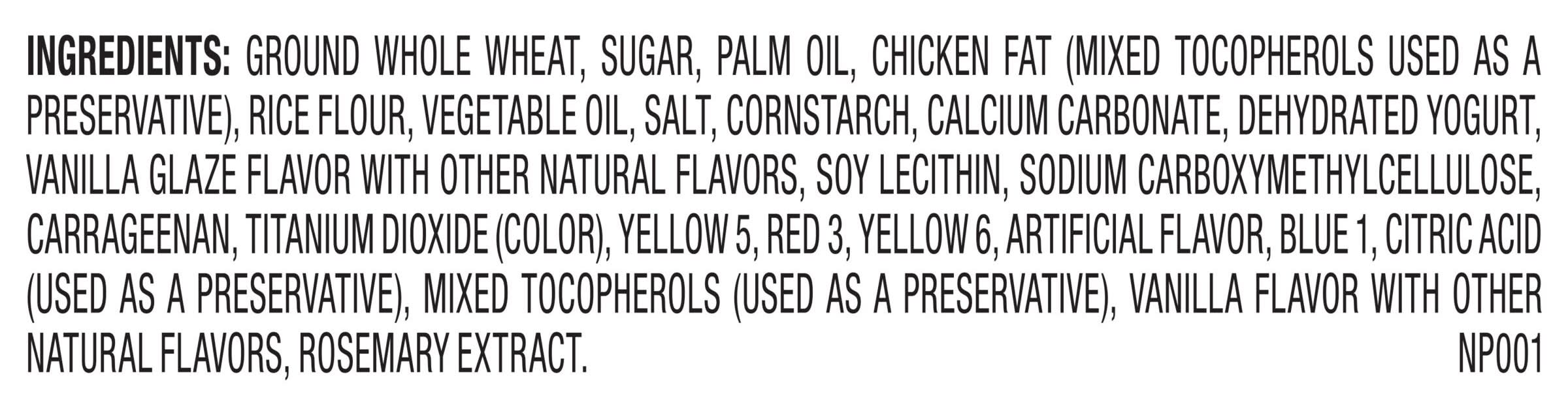 Ingredients: Ground Whole Wheat, Sugar, Palm Oil, Chicken Fat (Mixed Tocopherols Used As A Preservative), Rice Flour, Vegetable Oil, Salt, Cornstarch, Calcium Carbonate, Dehydrated Yogurt, Vanilla Glaze Flavor With Other Natural Flavors, Soy Lecithin, Sodium Carboxymethylcellulose, Carrageenan, Titanium Dioxide (Color), Yellow 5, Red 3, Yellow 6, Artificial Flavor, Blue 1, Citric Acid (Used As A Preservative), Mixed Tocopherols (Used As A Preservative), Vanilla Flavor With Other Natural Flavors, Rosemary Extract