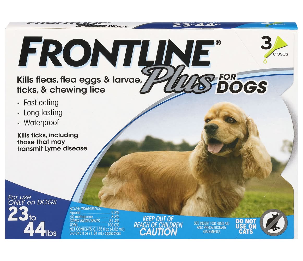 Plus for Dogs is a fast-acting and long-lasting treatment designed to control fleas, flea eggs, larvae, ticks, chewing lice, and sarcoptic mites on dogs. Each box contains three applicators, with each applicator holding 0.045 fl oz (1.34 ml) of the solution. The product is waterproof, ensuring continued effectiveness even after exposure to water. It is specifically formulated for dogs weighing between 23 to 44 lbs and is manufactured in France. It is effective against ticks, including those that may carry Lyme disease. The use of this product is restricted to dogs only. Size: 0.20 lb