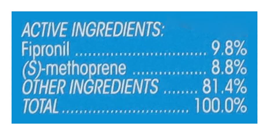 Ingredients: Active Ingredients: Fipronil 9.8%, (S)-Methoprene 8.8%, Other Ingredients: 81.4%, Total 100.0%