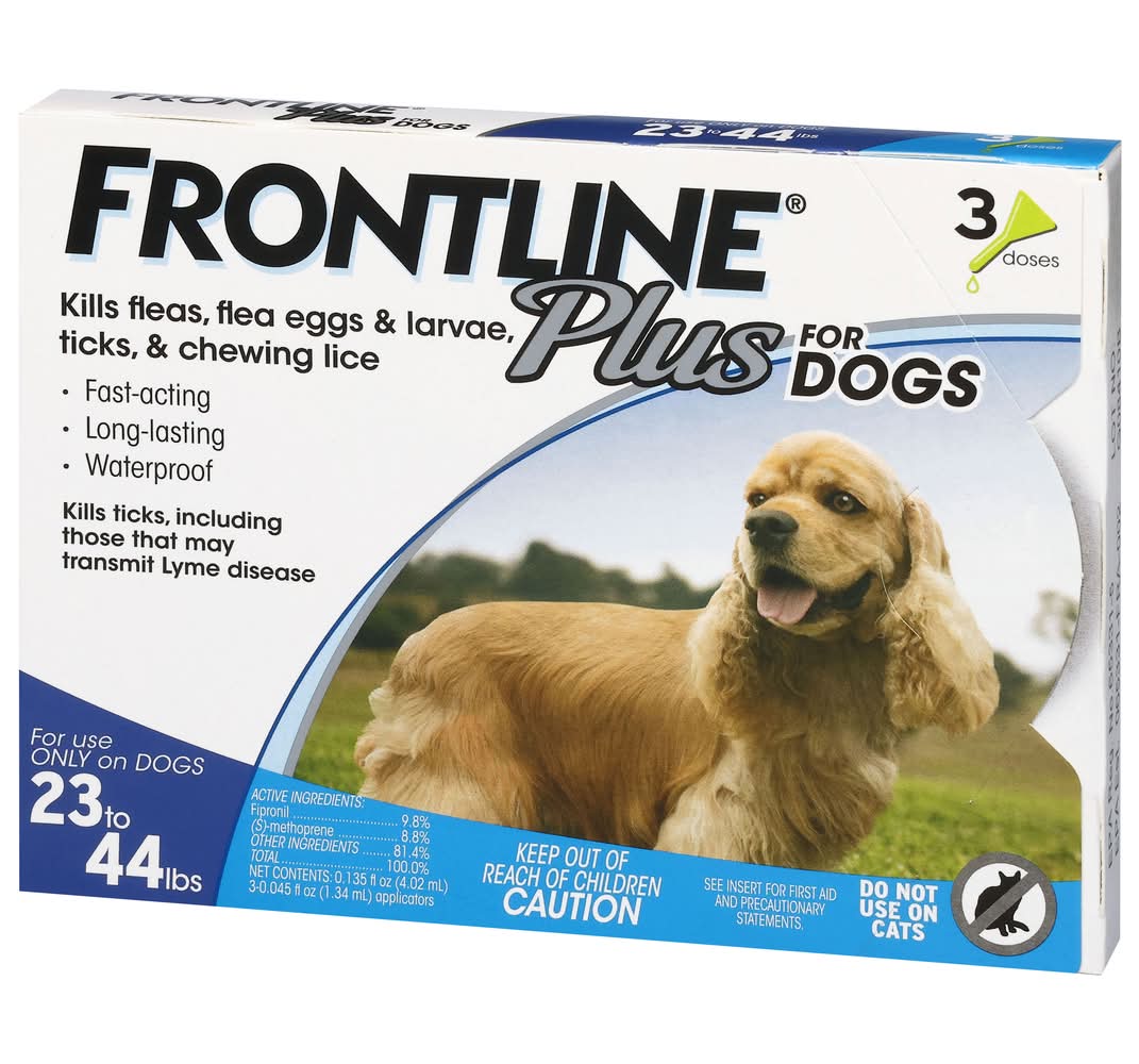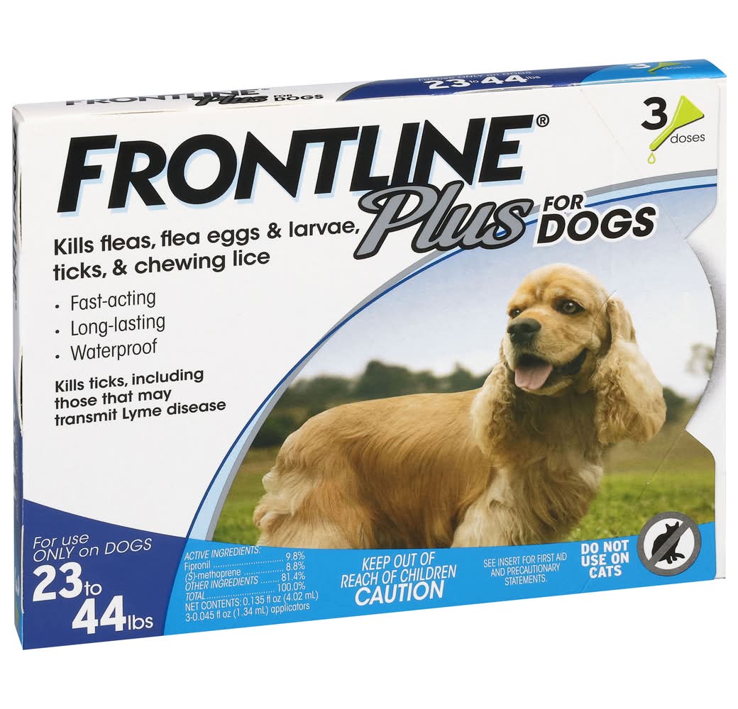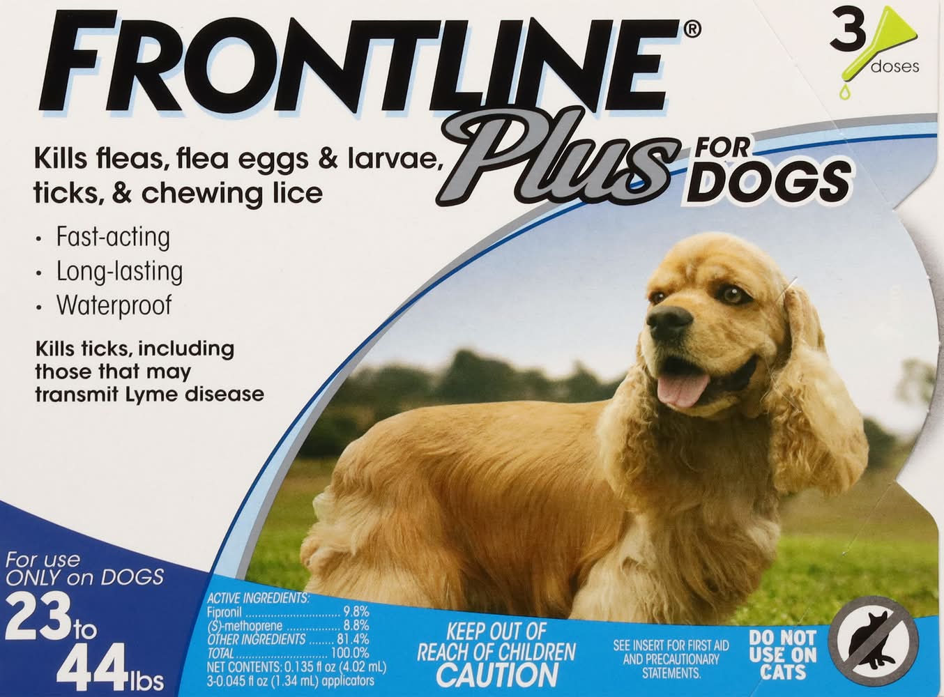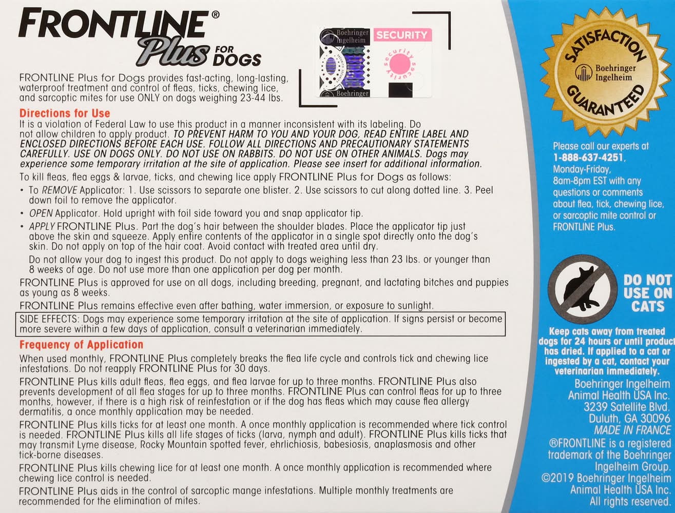 Directions: see insert for first aid and precautionary statements. it is a violation of federal law to use this product in a manner inconsistent with its labeling. do not allow children to apply product. to prevent harm to you and your pet, read entire label and enclosed directions before each use. follow all directions and precautionary statements carefully. use on dogs only. do not use on rabbits. do not use on other animals. to kill fleas, flea eggs & larvae, ticks, and chewing lice apply frontline plus for dogs as follows: to remove applicator: lift and remove the plastic tab to expose foil backing; then peel away the foil. or use scissors to open. open applicator. hold upright with foil side toward you and snap applicator tip. apply frontline plus. part the dog's hair between the shoulder blades. place the applicator tip just above the skin and squeeze. apply entire contents of the applicator in a single spot directly onto the animal's skin. do not apply on top of the hair coat. avoid contact with treated area until dry. frontline plus is approved for use on all dogs, including breeding, pregnant, and lactating bitches and puppies as young as 8 weeks. frontline plus remains effective even after bathing, water immersion, or exposure to sunlight. frequency of application: when used monthly, frontline plus completely breaks the flea life cycle and controls tick and chewing lice infestations. do not reapply frontline plus for 30 days. frontline plus kills adult fleas, flea eggs, and flea larvae for up to three months. frontline plus also prevents development of all flea stages for up to three months. frontline plus can control fleas for up to three months, however, if there is a high risk of reinfestation or if the pet has fleas which may cause flea allergy dermatitis, a once monthly application may be needed. frontline plus kills ticks for at least one month. a once monthly application is recommended where tick control is needed. frontline plus kills all life stages of ticks (larva, nymph and adult). frontline plus kills ticks that may transmit lyme disease, rocky mountain spotted fever, ehrlichiosis, babesiosis, anaplasmosis and other tick-borne diseases. frontline plus kills chewing lice for at least one month. a once monthly application is recommended where chewing lice control is needed. frontline plus aids in the control of sarcoptic mange infestations. multiple monthly treatments are recommended for the elimination of mites.