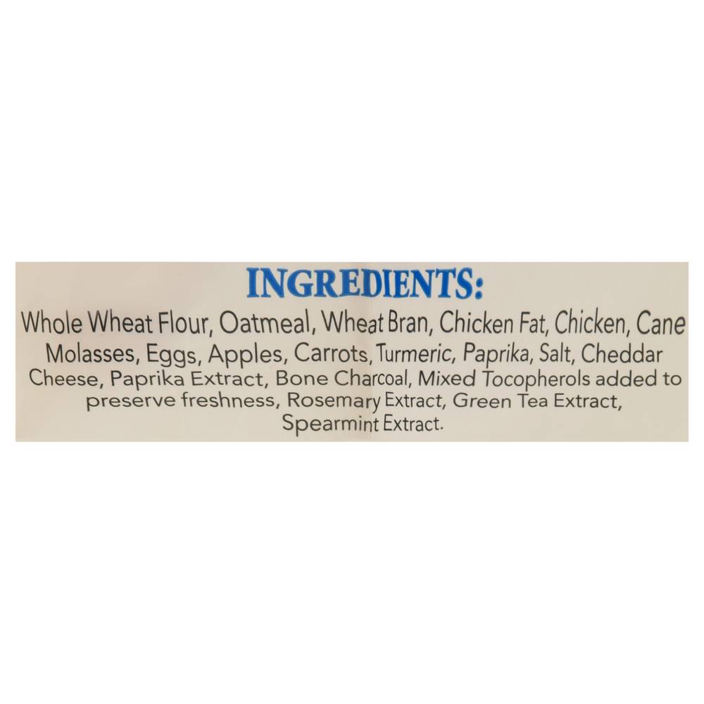 Ingredients: Whole Wheat Flour, Oatmeal, Wheat Bran, Chicken Fat, Chicken, Cane Molasses, Eggs, Apples, Carrots, Turmeric, Paprika, Salt, Cheddar Cheese, Paprika Extract, Bone Charcoal, Mixed Tocopherols added to preserve freshness, Rosemary Extract, Green Tea Extract, Spearmint Extract.\t\t\t\t\t\t\t\t\t Contains: Soy Free ; Beef Free