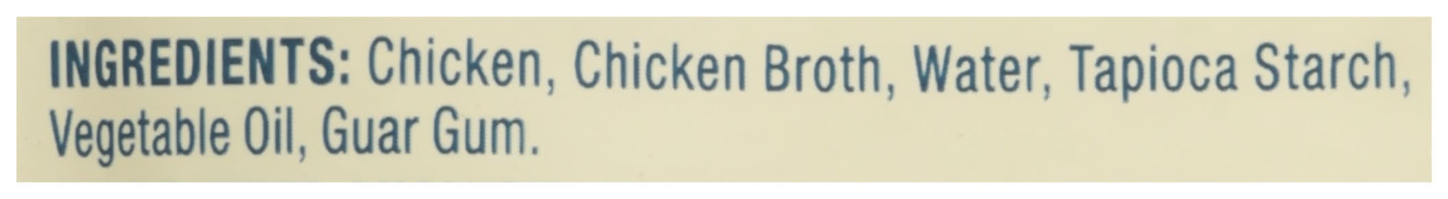 Ingredients: Chicken, Chicken Broth, Water, Tapioca Starch, Vegetable Oil, Guar Gum