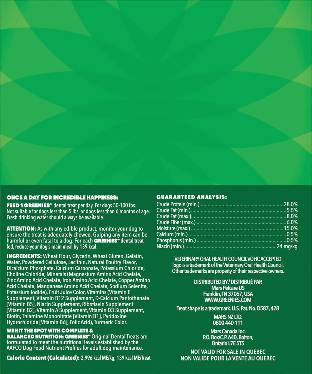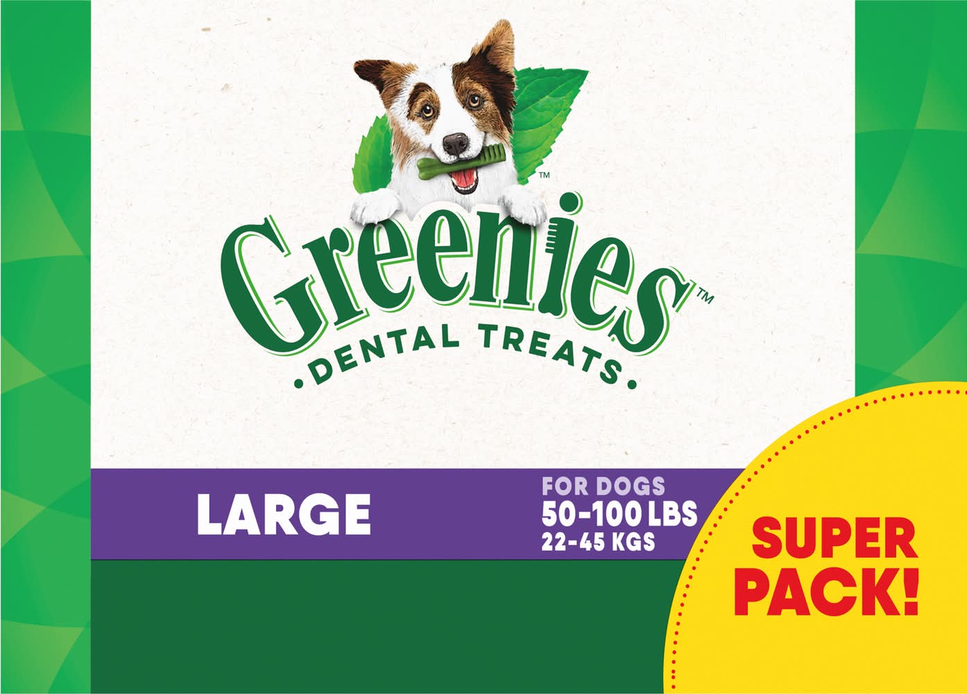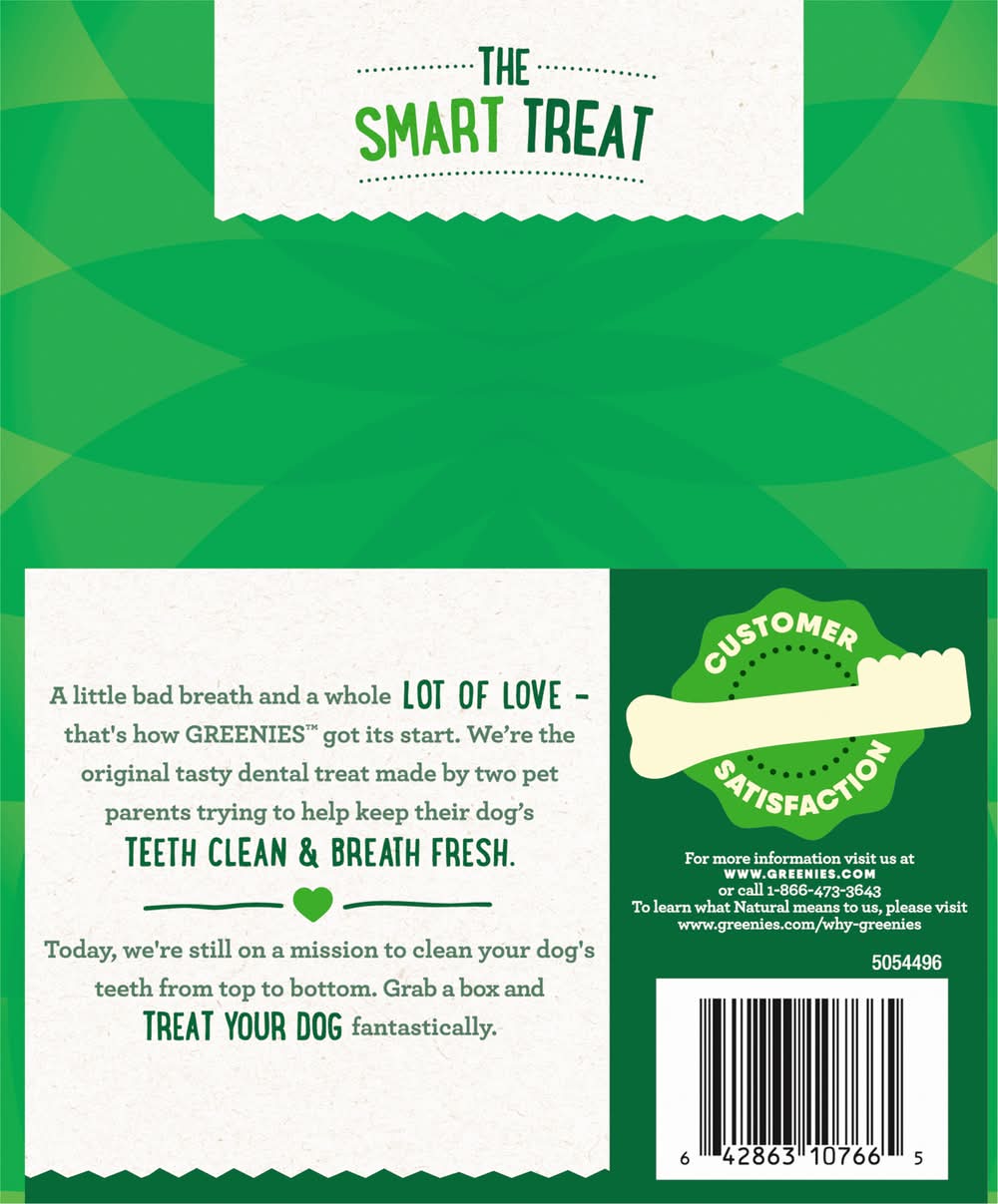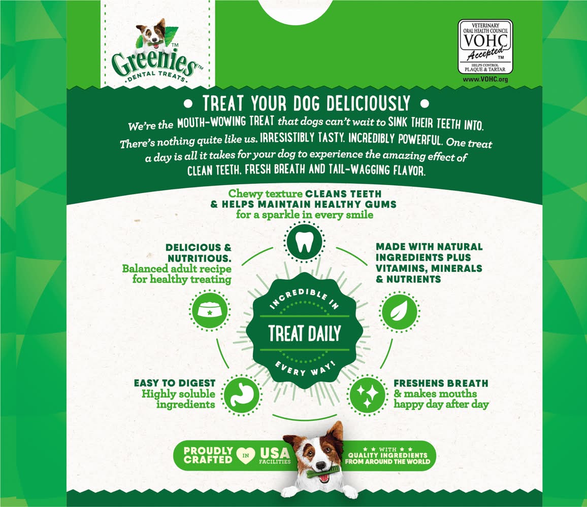 For dogs 50-100 lbs (22-45 kgs). Daily dog treats. Treat your dog deliciously. We're the mouth-wowing treat that dogs can't wait to sink their teeth into. There's nothing quite like us. Irresistibly tasty. Incredibly powerful. One treat a day is all it takes for your dog to experience the amazing effect of clean teeth. Fresh breath and tail-wagging flavor. Chewy texture cleans teeth & helps maintain healthy gums for a sparkle in every smile. Incredible treat daily every way! Delicious & nutritious. Balanced adult recipe for healthy treating. Made with natural ingredients plus vitamins, minerals & nutrients. Freshens breath & makes mouths happy day after day. Easy to digest highly soluble ingredients. The smart treat. A little bad breath and a whole lot of love - that's how greenies got its start. We're the original tasty dental treat made by two pet parents trying to help keep their dog's teeth clean & breath fresh. Today, we're still on a mission to clean your dog's teeth from top to bottom. Grab a box and treat your dog fantastically. Veterinary Oral Health Council VOHC Accepted: Helps control tartar. Helps control plaque. www.VOHC.org. www.greenies.com. For more information visit us at www.greenies.com or call 1-866-473-3643 to learn what natural means to us, please visit www.greenies.com/why-greenies. Proudly crafted in USA facilities with quality ingredients from around the world. • Size: 3.38 lb • Mars Petcare US, Franklin, TN, 37067, Ph: 866-473-3643