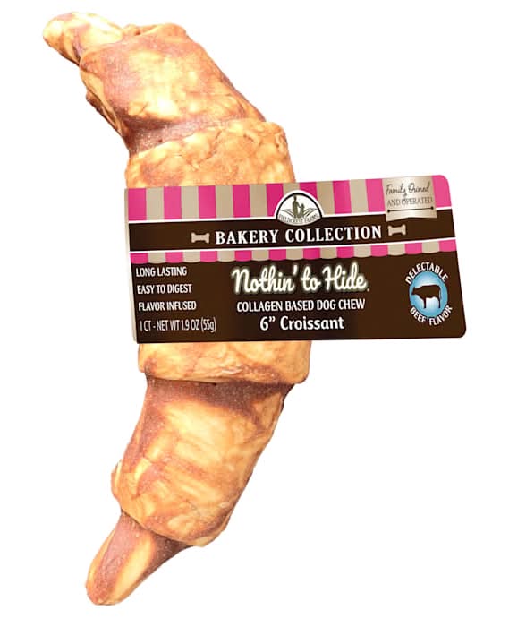 Nothin' to Hide chews are highly digestible, long lasting, collagen based chews. Available in a wide range of sizes and shapes, our delectable beef coated chews are sure to offer a safe, flavorful chewing experience for your pets. Contains 1 croissant dog chew with Flag Label. Size: 0.13 lb