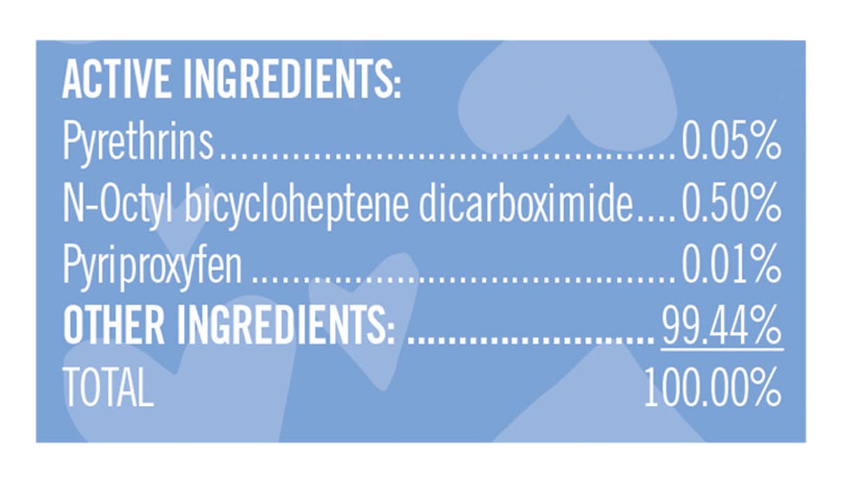 Ingredients: Active Ingredients: Pyrethrins - 0.05%. N-Octyl Bicycloheptene Dicarboximide - 0.50%. Pyriproxyfen - 0.01% Other Ingredients: - 99.44%. Total - 100.00%