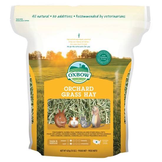 Animals love the sweet smell and taste of leafy Oxbow Orchard Grass Hay, and that makes it a good addition to an herbivore's healthy meal plan. Like other long-strand grass hays, the soft-textured Orchard Grass Hay is high in fiber, low in protein and supports the health of small herbivores by stimulating digestion, preventing obesity and making mealtime more appealing. Mix Orchard Grass Hay with other Oxbow grass hays to create a sweet and nutritious combination. Size: 0.94 lb