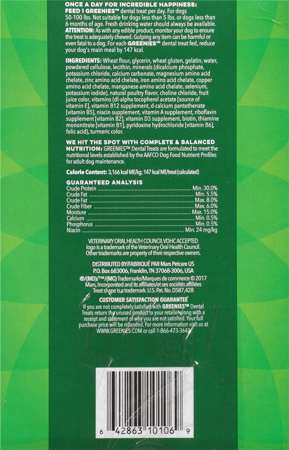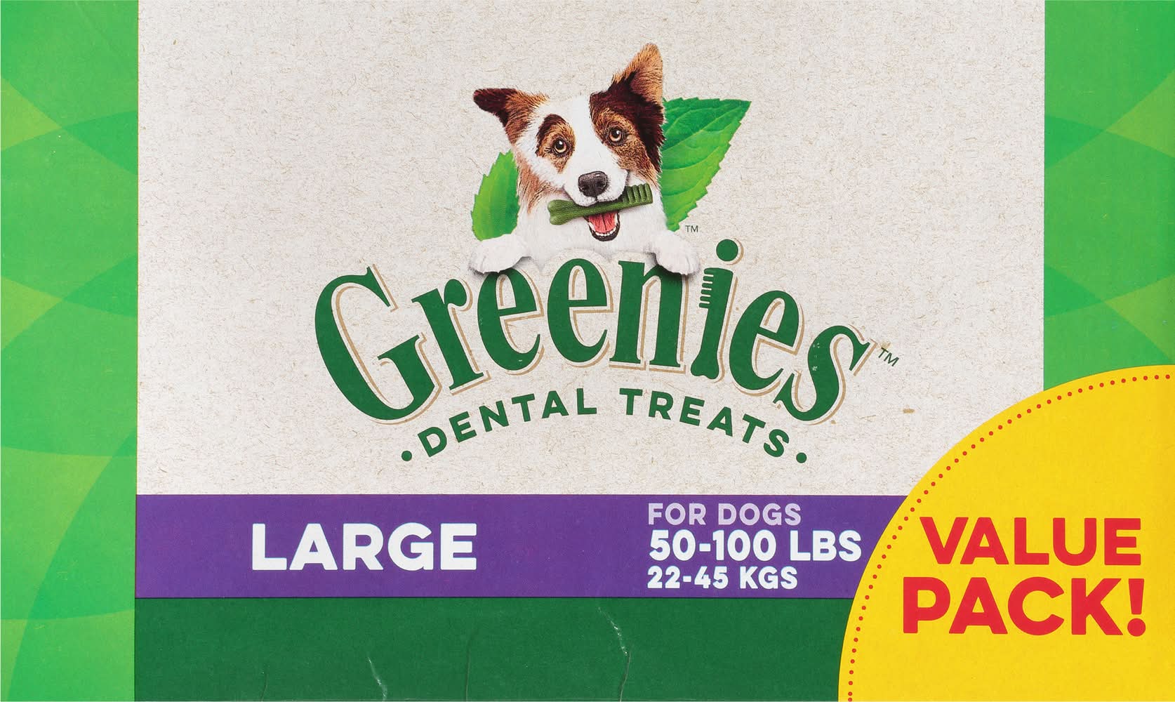 Once a day for incredible happiness: feeding guidelines: feed 1 greenies dental treat per day. for dogs 50-100 lbs. not suitable for dogs less than 5 lbs. or dogs less than 6 months of age. fresh drinking water should always be available. attention: as with any edible product, monitor your dog to ensure the treat is adequately chewed. gulping any item can be harmful or even fatal to a dog. for each greenies dental treat fed, reduce your dog's main meal by 137 kcal.