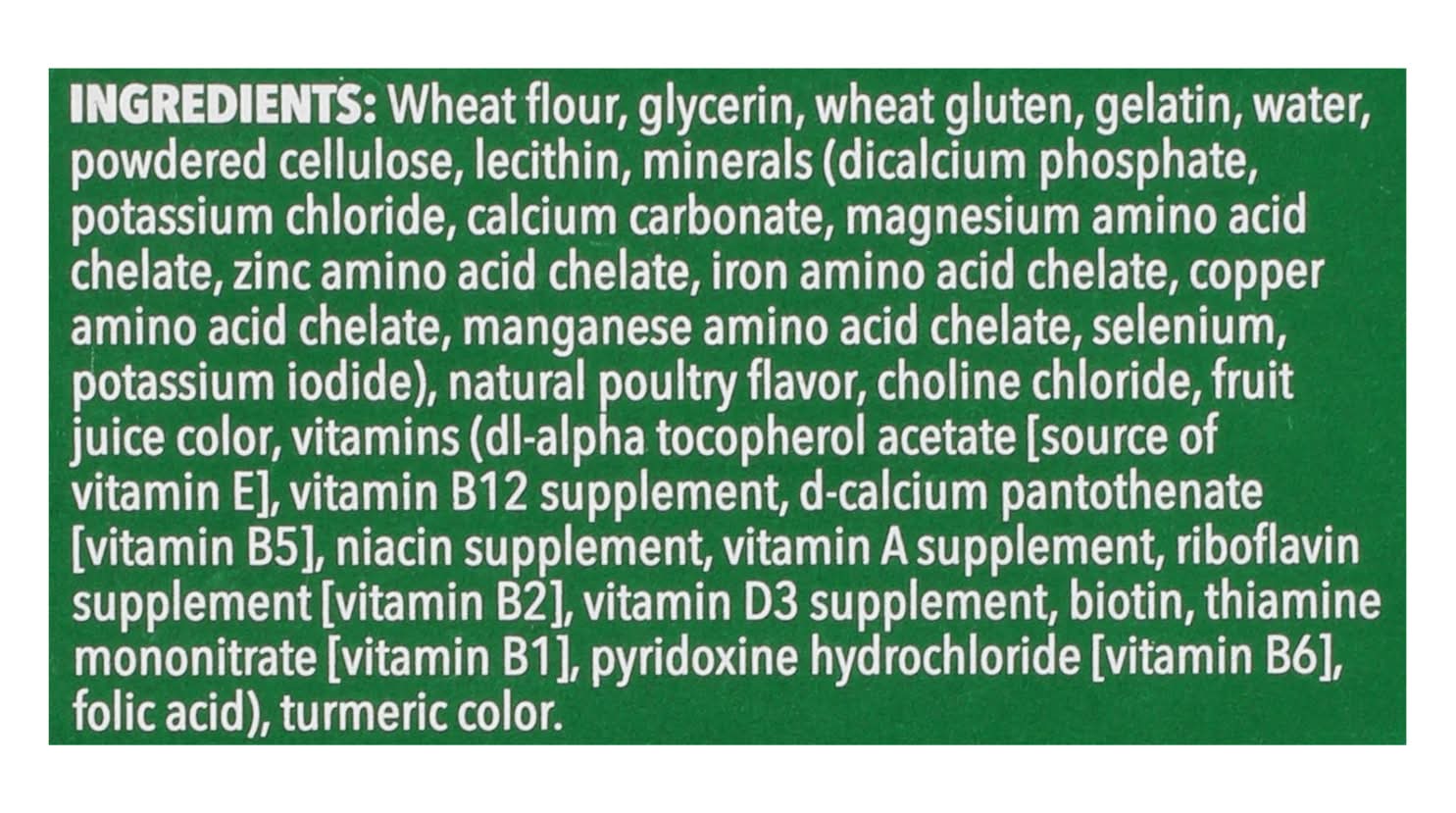 Ingredients: Wheat Flour, Glycerin, Wheat Gluten, Gelatin, Water, Powdered Cellulose, Lecithin, Minerals (Dicalcium Phosphate, Potassium Chloride, Calcium Carbonate, Magnesium Amino Acid Chelate, Magnesium Amino Acid Chelate, Zinc Amino Acid Chelate, Iron Amino Acid Chelate, Copper Amino Acid Chelate, Manganese Amino Acid Chelate, Selenium, Potassium Iodide), Natural Poultry Flavor, Choline Chloride, Fruit Juice Color, Vitamins (DL Alpha Tocopherol Acetate [Source of Vitamin E], Vitamin B12 Supplement, D Calcium Pantothenate [Vitamin B5], Niacin Supplement, Vitamin A Supplement, Riboflavin Supplement [Vitamin B2], Vitamin D3 Supplement, Biotin, Thiamine Mononitrate [Vitamin B1], Pyridoxine Hydrochloride [Vitamin B6], Folic Acid), Turmeric Color Contains: Wheat, Gluten