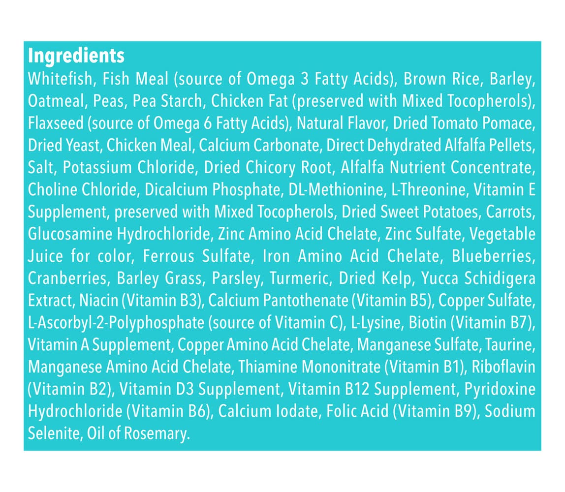 Ingredients: Whitefish, Fish Meal (Source of Omega 3 Fatty Acids), Brown Rice, Barley, Oatmeal, Peas, Pea Starch, Chicken Fat (Preserved with Mixed Tocopherols), Flaxseed (Source of Omega 6 Fatty Acids), Natural Flavor, Dried Tomato Pomace, Dried Yeast, Chicken Meal, Calcium Carbonate, Direct Dehydrated Alfalfa Pellets, Salt, Potassium Chloride, Dried Chicory Root, Alfalfa Nutrient Concentrate, Choline Chloride, Dicalcium Phosphate, DL-Methionine, L-Threonine, Vitamin E Supplement, Preserved with Mixed Tocopherols, Dried Sweet Potatoes, Carrots, Glucosamine Hydrochloride, Zinc Amino Acid Chelate, Zinc Sulfate, Vegetable Juice for Color, Ferrous Sulfate, Iron Amino Acid Chelate, Blueberries, Cranberries, Barley Grass, Parsley, Turmeric, Dried Kelp, Yucca Schidigera Extract, Niacin (Vitamin B3), Calcium Pantothenate (Vitamin B5), Copper Sulfate, L-Ascorbyl-2-Polyphosphate (Source of Vitamin C), L-Lysine, Biotin (Vitamin B7), Vitamin A Supplement, Copper Amino Acid Chelate, Manganese Sulfate, Taurine, Manganese Amino Acid Chelate, Thiamine Mononitrate (Vitamin B1), Riboflavin (Vitamin B2), Vitamin D3 Supplement, Vitamin B12 Supplement, Pyridoxine Hydrochloride (Vitamin B6), Calcium Lodate, Folic Acid (Vitamin B9), Sodium Selenite, Oil of Rosemary Contains: Oat, Barley, Fish