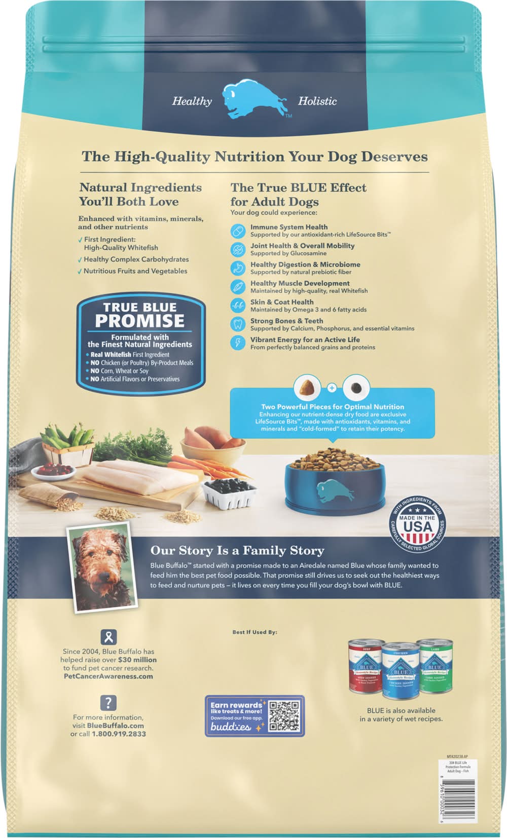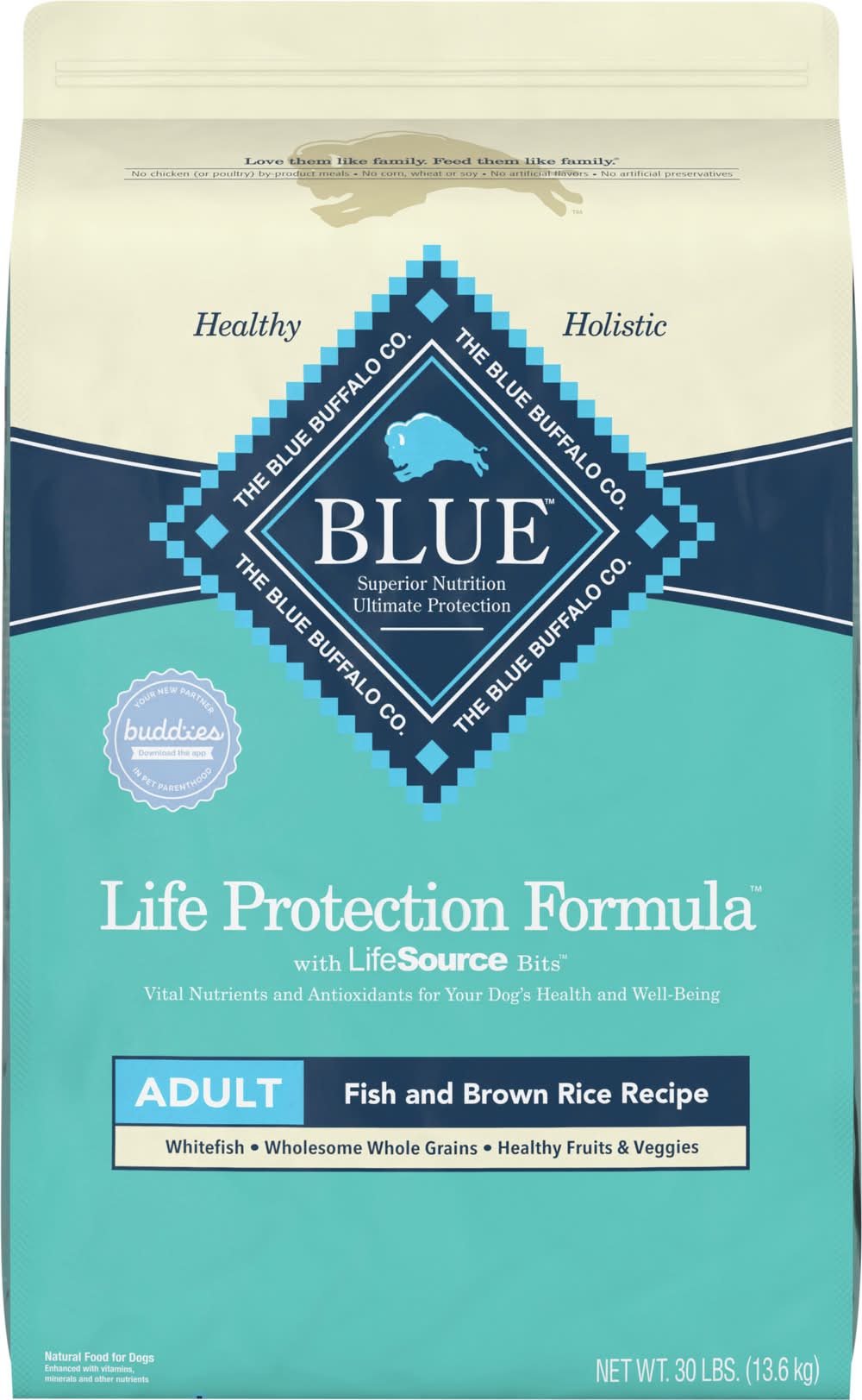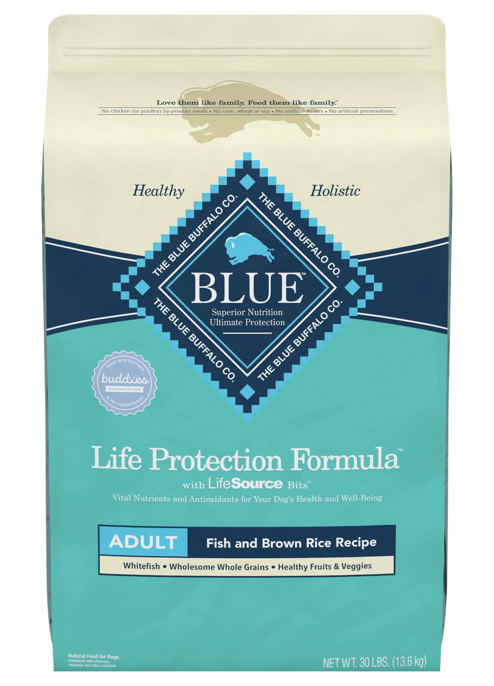 BLUE Life Protection Formula Dog Food is formulated to help your best friend thrive. This dry dog food is made with the finest natural ingredients -- including real whitefish, wholesome whole grains, and healthy fruits and veggies -- to support your dog's health and wellness. BLUE Life Protection Formula also features antioxidant-rich LifeSource Bits to support immune system health, life stage requirements, and a healthy oxidative balance. Like all Blue Buffalo dog food recipes, BLUE Life Protection Formula contains no chicken (or poultry) by-product meals. This natural dry dog food is also free of corn, wheat, soy, artificial flavors, and preservatives. Size: 30.28 lb