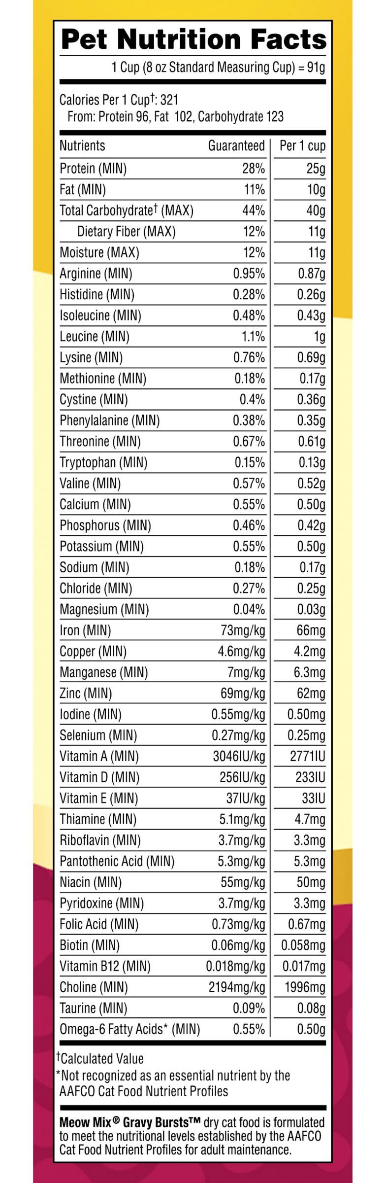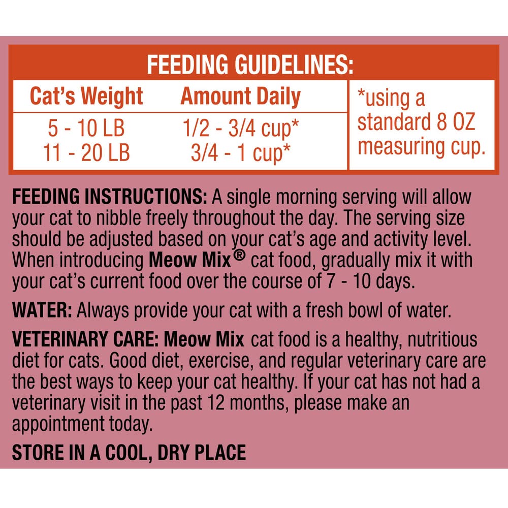 Feeding guidelines: cat's weight: 5 - 10 lb; amount daily: 1/2 - 3/4 cup* cat's weight: 11 - 20 lb; amount daily: 3/4 - 1 cup* *using a standard 8 oz measuring cup. feeding instructions: a single morning serving will allow your cat to nibble freely throughout the day. the serving size should be adjusted based on your cat's age and activity level. when introducing meow mix® cat food, gradually mix it with your cat's current food over the course of 7-10 days. water: always provide your cat with a fresh bowl of water. veterinary care: meow mix cat food is a healthy, nutritious diet for cats. good diet, exercise, and regular veterinary care are the best ways to keep your cat healthy. if your cat has not had a veterinary visit in the past 12 months, please make an appointment today.