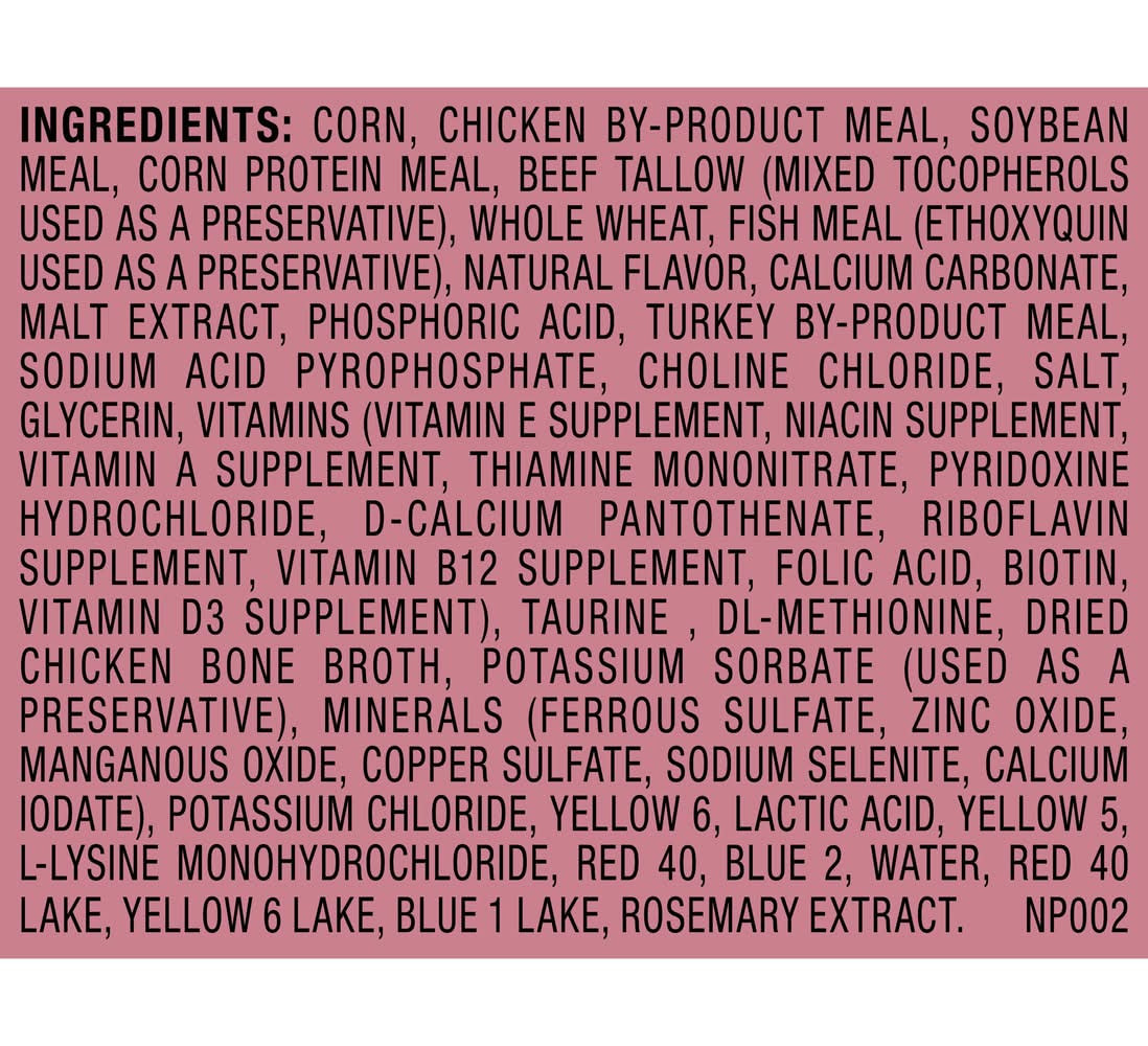 Ingredients: Corn, Chicken By-Product Meal, Soybean Meal, Corn Protein Meal, Beef Tallow (Mixed Tocopherols Used As A Preservative), Whole Wheat, Fish Meal (Ethoxyquin Used As A Preservative), Natural Flavor, Calcium Carbonate, Malt Extract, Phosphoric Acid, Turkey By-Product Meal, Sodium Acid Pyrophosphate, Choline Chloride, Salt, Glycerin, Vitamins (Vitamin E Supplement, Niacin Supplement, Vitamin A Supplement, Thiamine Mononitrate, Pyridoxine Hydrochloride, D-Calcium Pantothenate, Riboflavin Supplement, Vitamin B12 Supplement, Folic Acid, Biotin, Vitamin D3 Supplement), Taurine, Dl-Methionine, Dried Chicken Bone Broth, Potassium Sorbate (Used As A Preservative), Minerals (Ferrous Sulfate, Zinc Oxide, Manganous Oxide, Copper Sulfate, Sodium Selenite, Calcium Iodate), Potassium Chloride, Yellow 6, Lactic Acid, Yellow 5, L-Lysine Monohydrochloride, Red 40, Blue 2, Water, Red 40 Lake, Yellow 6 Lake, Blue 1 Lake, Rosemary Extract Contains: Soybeans, Wheat, Fish