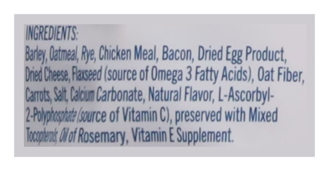 Ingredients: Barley, Oatmeal, Rye, Chicken Meal, Bacon, Dried Egg Product, Dried Cheese, Flaxseed (Source of Omega 3 Fatty Acids), Oat Fiber, Carrots, Salt, Calcium Carbonate, Natural Flavor, L-Ascorbyl2-Polyphosphate (Source of Vitamin C), Preserved with Mixed Tocopherols, Oil of Rosemary, Vitamin E Supplement Contains: Barley, Eggs, Oat
