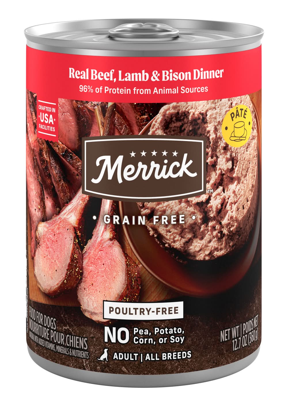 Nourish your dog with the high quality protein and healthy fats needed to thrive when you serve this merrick grain free wet dog food real beef, lamb and bison dinner. Featuring real usda inspected deboned beef as the first ingredient, this canned dog food grain free recipe contains 96 percent protein from animal sources and wholesome ingredients including vitamins and minerals for complete and balanced nutrition. To meet your dog's dietary needs, this merrick wet dog food is a natural dog food canned recipe made without artificial colors, flavors, or preservatives and is a poultry free, pea free, potato free and chicken free dog food. The tender pate texture makes this real meat dog food ideal for all breeds and sizes. Offer this can dog food with real deboned beef as a delicious standalone meal, or serve your dog wet food as a flavorful topper to make your dog's dry kibble even more tempting. Merrick dog food recipes were proudly founded in hereford, tx, and are crafted in US facilities. Size: 0.91 lb