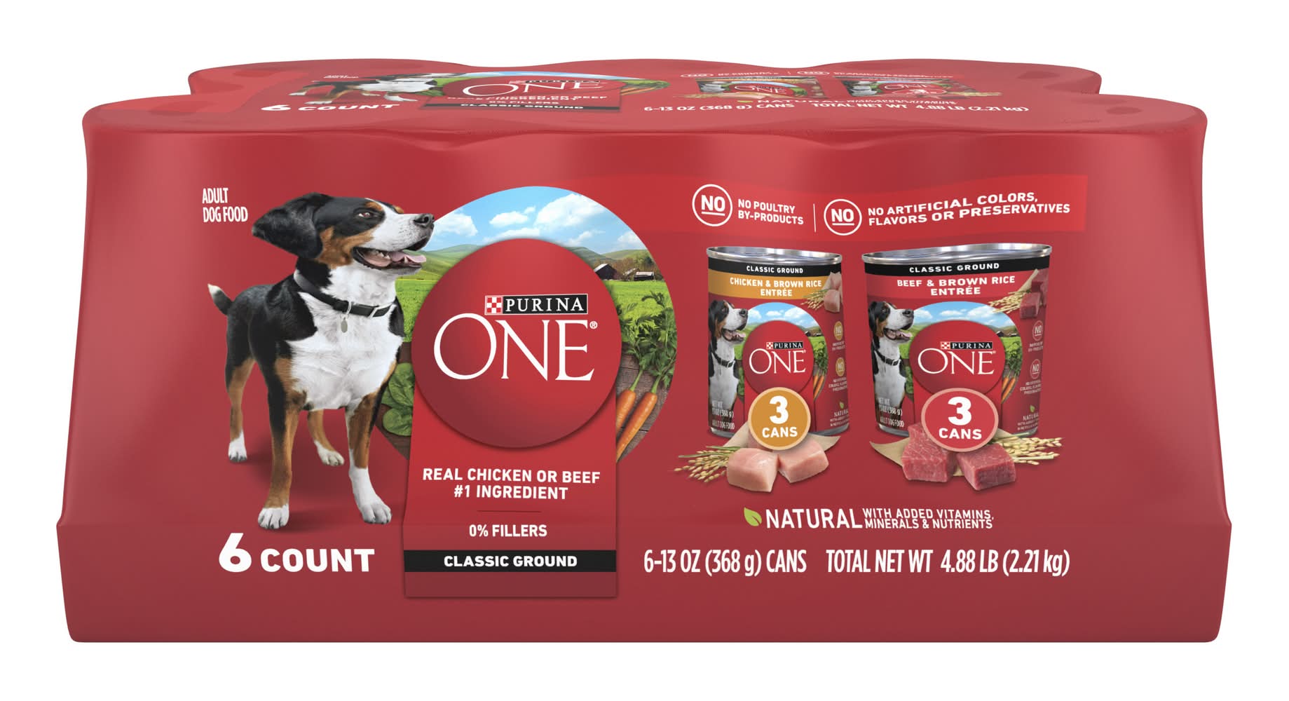 Purina One Classic Ground Chicken and Brown Rice Entrees Wet Dog Food, Adult (6 x 13 oz)
