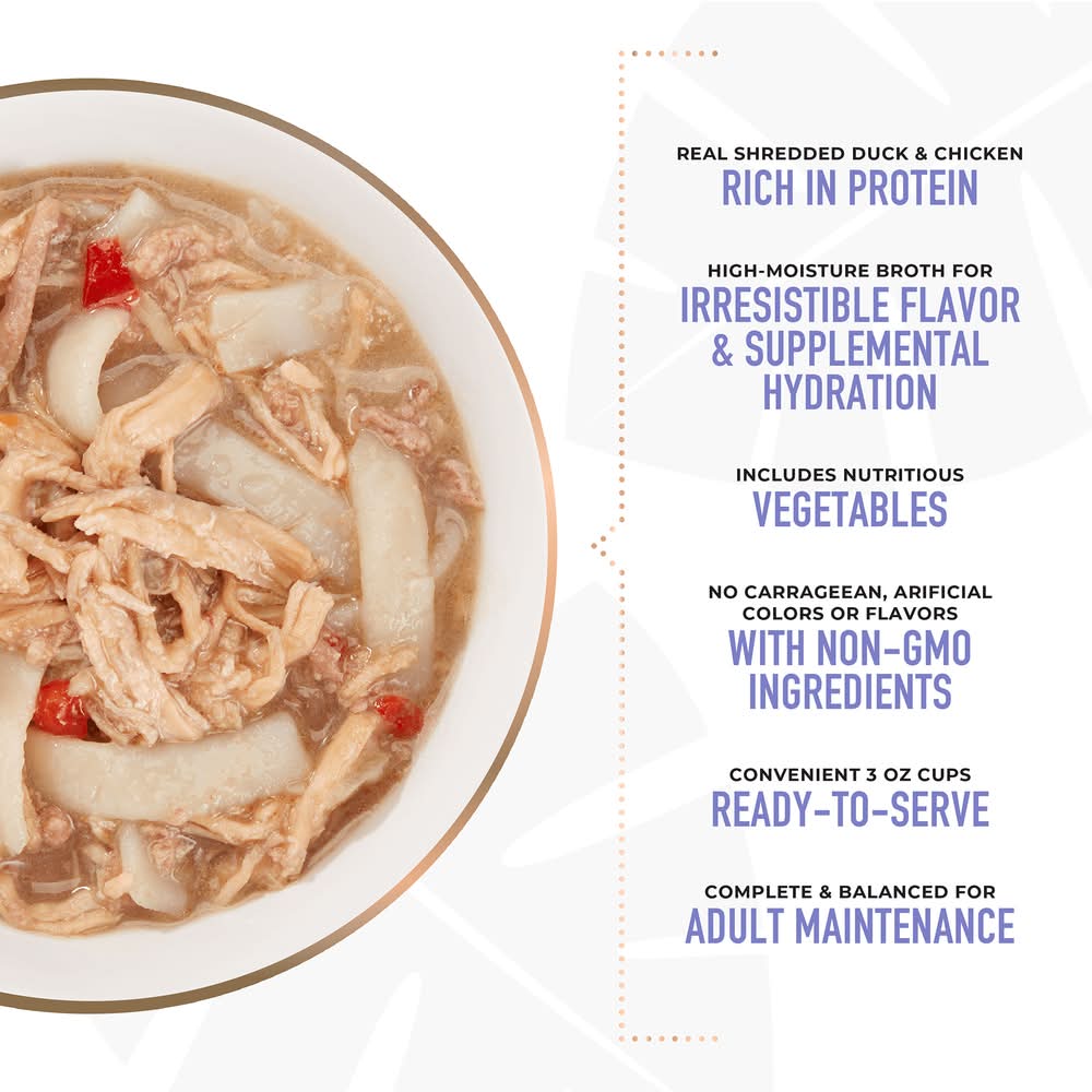 Ingredients: Chicken broth, duck, chicken, rice noodle (rice, water), cabbage, sunflower seed oil, red bell pepper, orange juice, potassium chloride, xanthan gum, choline chloride, magnesium sulfate, dicalcium phosphate, tuna oil, thiamine mononitrate (vitamin B1), vitamin E supplement, ferrous sulfate, niacin (vitamin B3), zinc oxide, vitamin A supplement, biotin, vitamin B12 supplement, copper amino acid chelate, manganous oxide, calcium pantothenate, riboflavin, sodium selenite, pyridoxine hydrochloride (vitamin B6), folic acid, potassium iodide, vitamin D3 supplement.