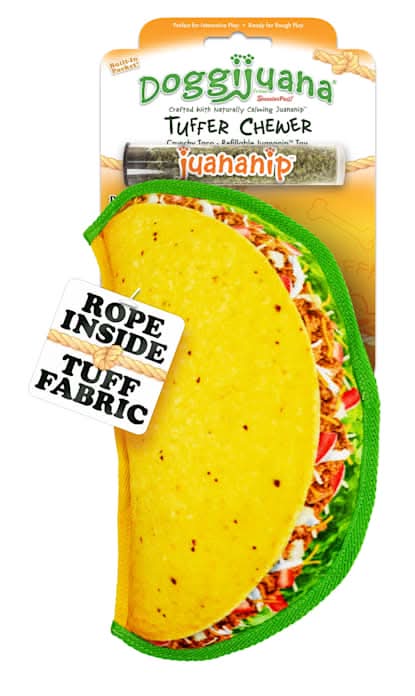 Taco 'bout a toy your pup will love! The Doggijuana Tuffer Chewer Crunchy Taco is perfect for medium and large breeds with a light chewing style. Crafted with tuff fabric, a rope core, and a refillable Juananip pocket, this fiesta-inspired toy will keep your furry friend entertained through every chew, tug, and toss. Durable and deliciously playful, this taco is the ultimate way to spice up your pup's playtime-no hot sauce required! Size: 0.35 lb