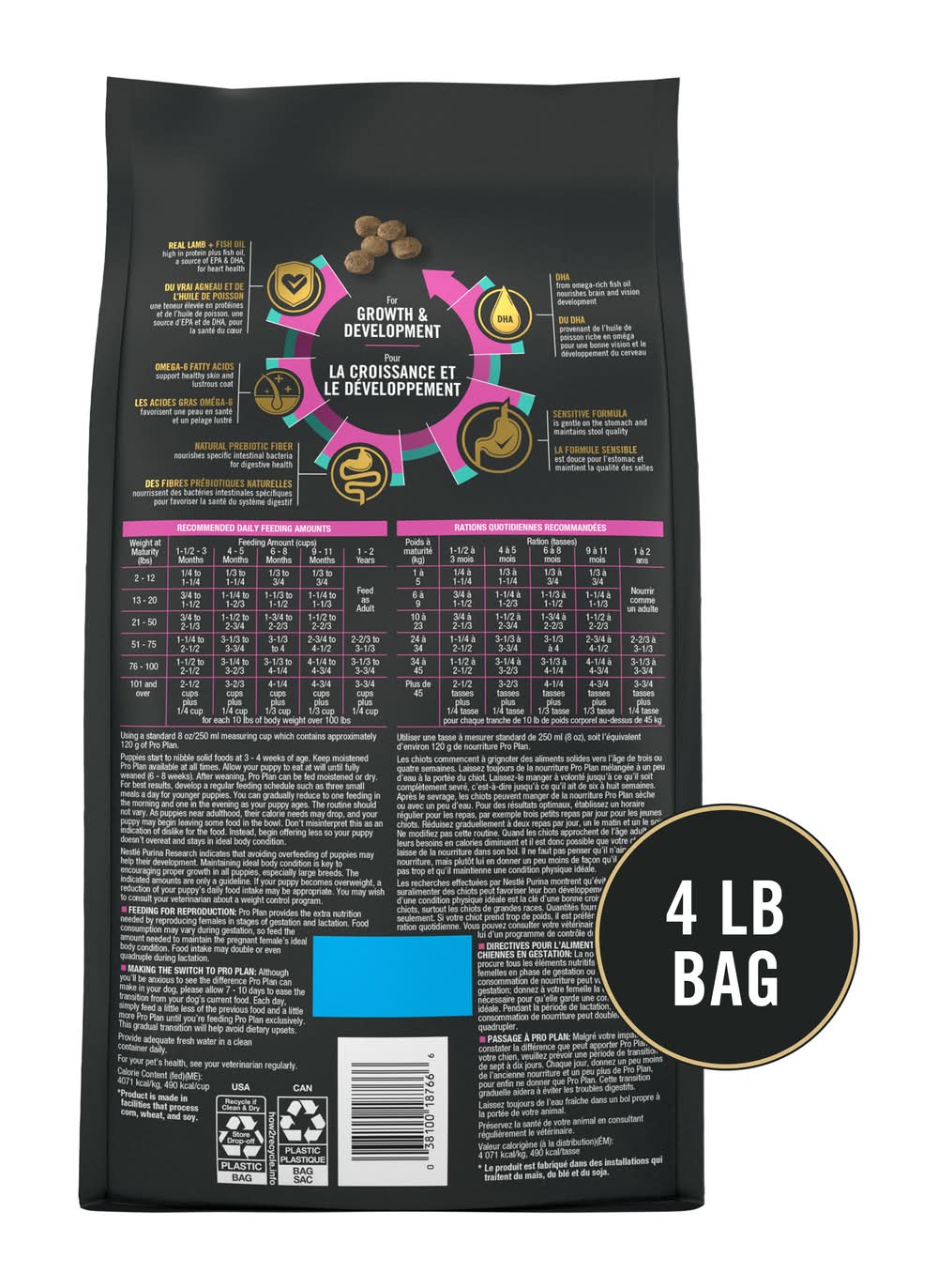 Rich in the Nutrients Puppies Need During Their First Year of Development, This High Protein Dog Food Features Lamb As the Number One Ingredient and Oat Meal, Which Is Gentle on His Sensitive Stomach. Omega-6 Fatty Acids and Vitamin a Nourish Your Puppy’s Skin and Lustrous Coat, While Antioxidants Support His Developing Immune System. for His Digestive Health, This Dog Food for Sensitive Stomachs Contains Natural Prebiotic Fiber That Nourishes Specific Intestinal Bacteria. to Support His Brain and Vision Development, Purina Includes Dha from Omega-rich Fish Oil As Well As Calcium, Phosphorus and Other Minerals to Help Strengthen Their Teeth and Bones. • Size: 4.10 lb • Packaging: Reusable