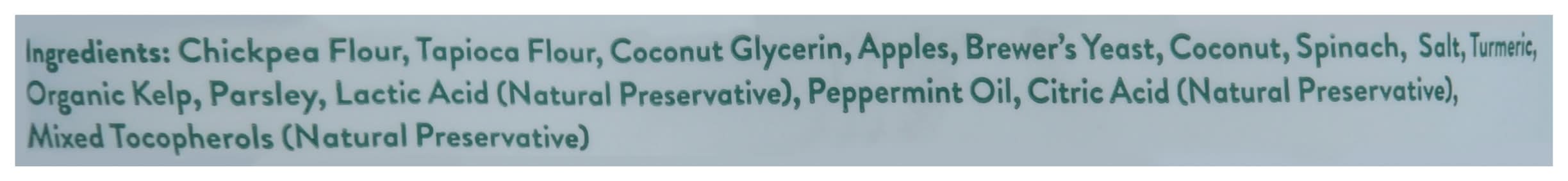 Ingredients: Chickpea Flour, Tapioca Flour, Coconut Glycerin, Apples, Brewer's Yeast, Coconut, Spinach, Salt, Turmeric, Organic Kelp, Parsley, Lactic Acid (Natural Preservative), Peppermint Oil, Citric Acid (Natural Preservative), Mixed Tocopherols (Natural Preservative) Contains: Tree Nuts